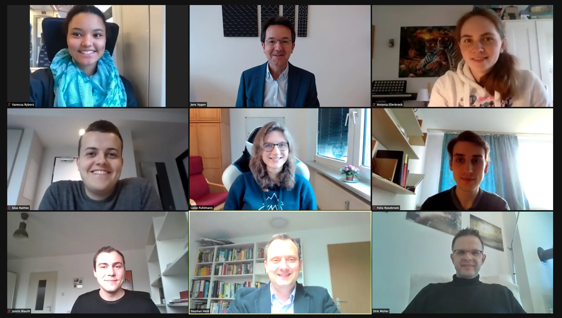 Im Uhrzeigersinn, beginnend bei 12 Uhr: Professor Jens Vygen, Antonia Ellerbrock, Felix Rosebrock, Dr. Dirk Müller, Professor Stephan Held, Jannis Blauth (Doktorand), Silas Rathke, Vanessa Ryborz und in der Mitte Luise Puhlmann.