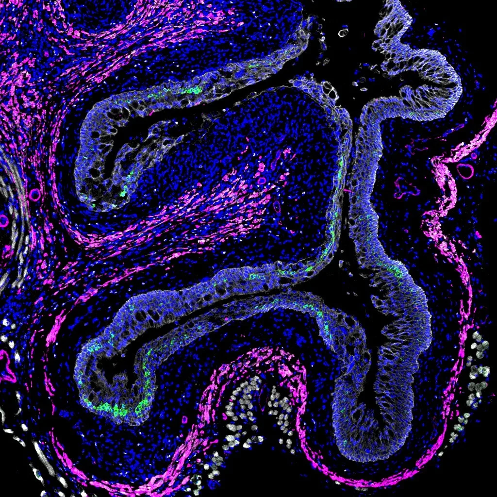 aus dem Genitaltrakt einer weiblichen Maus. Die genetische Bauanleitung von Interleukin-33 wurde grün angefärbt. Der Botenstoff sorgt indirekt für die Heranreifung der Granulozyten.