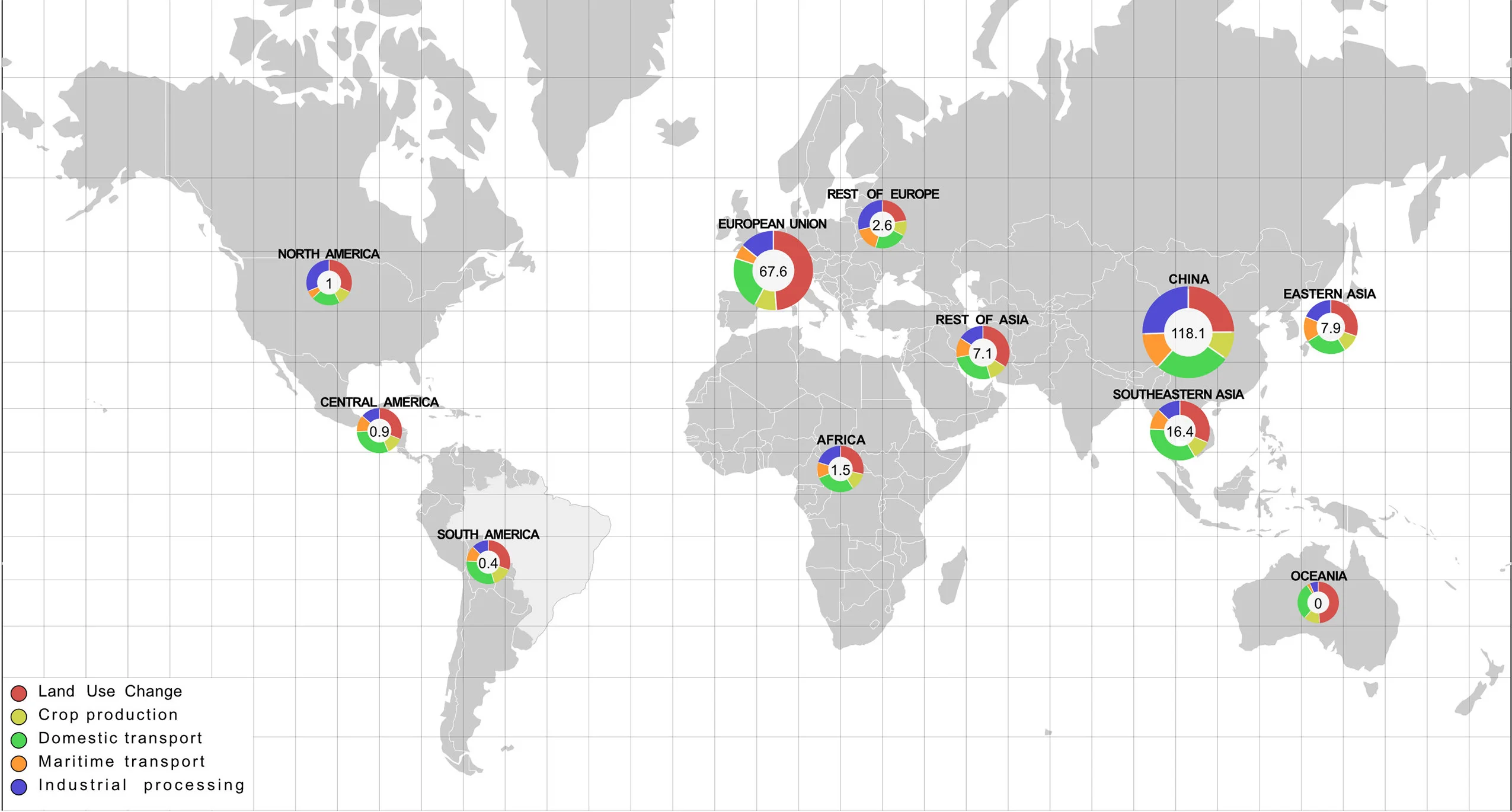 zwischen 2010 und 2015 67,6 Millionen Tonnen Treibhausgasemissionen, die in den gesamten brasilianischen Sojaimporten enthalten sind, während China 118,1 Millionen Tonnen importierte.