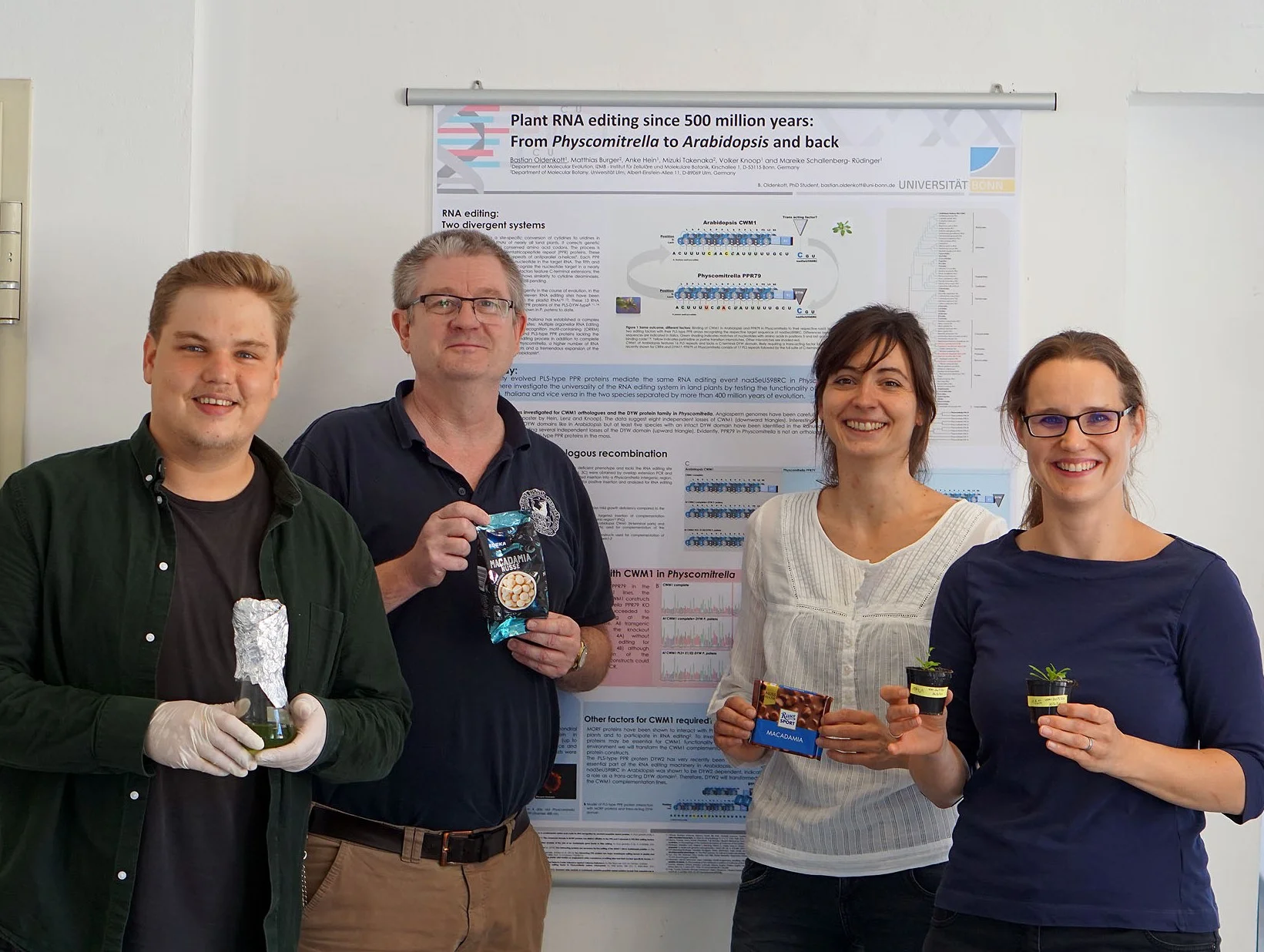 (von links) Bastian Oldenkott, Prof. Volker Knoop, Dr. Anke Hein und Dr. Mareike Schallenberg-Rüdinger erforschen das RNA-Editing in evolutionär weit entfernten Pflanzen.