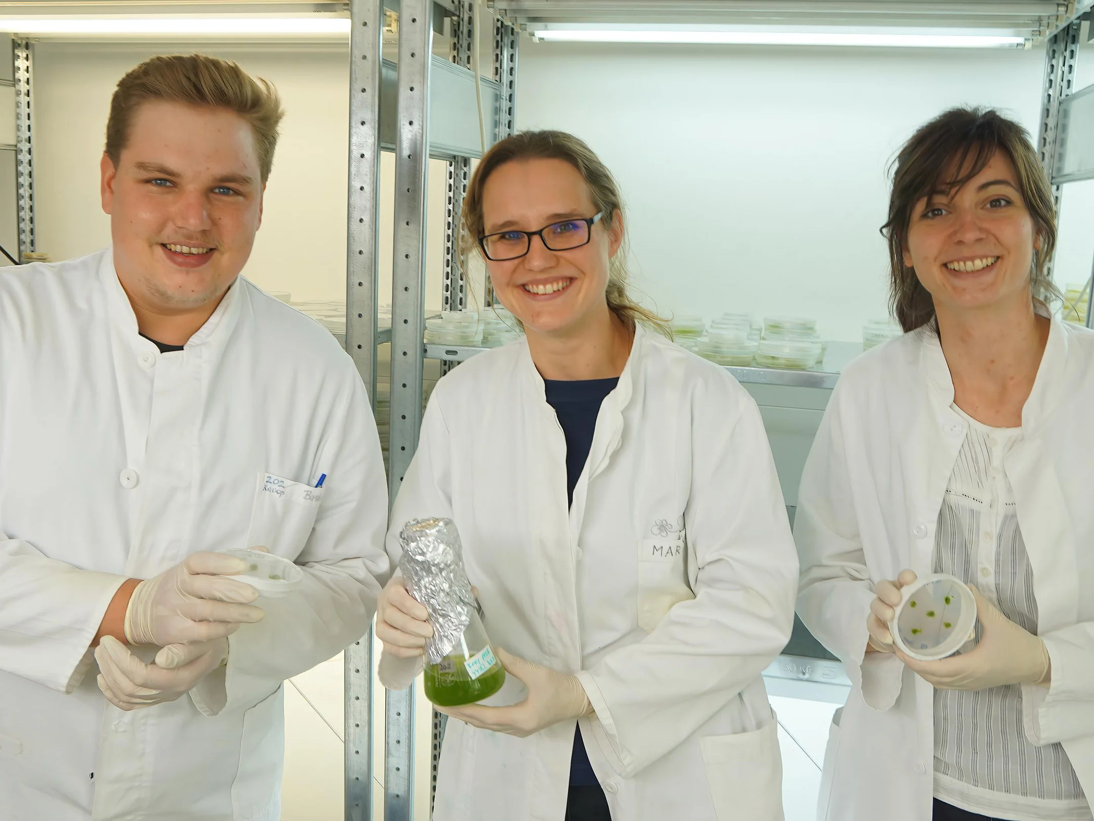 (von links) Bastian Oldenkott, Dr. Mareike Schallenberg-Rüdinger und Dr. Anke Hein untersuchen Linien des Mooses Physcomitrium mit eingebrachten Editing-Faktoren aus Blütenpflanzen.