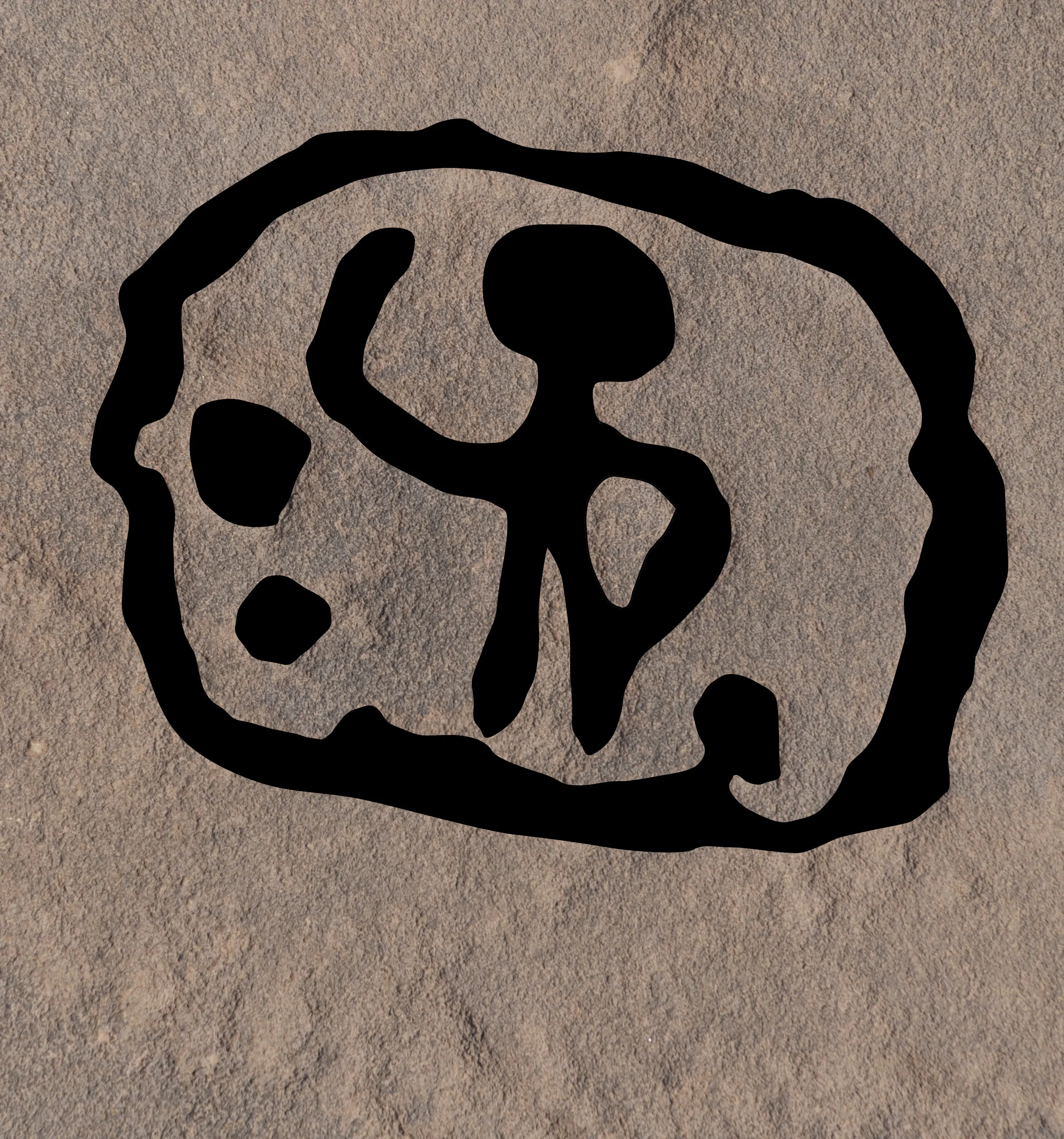 Der Herrscher trampelt einen Mann nieder (liegend). Die beiden runden Kreisflächen dahinter sind nicht Kugeln, sondern abgeschlagene Köpfe.