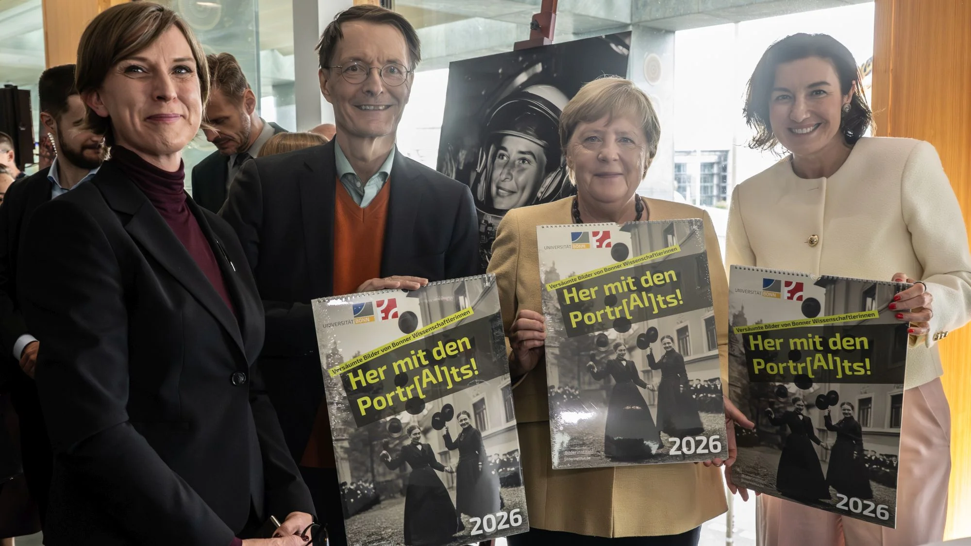 Erhielten den offiziellen Kalender der Bonner Ausstellung "Her mit den Portr[AI]ts!": (v.r.) Ministerin Dorothee Bär, Dr. Angela Merkel, Prof. Dr. Karl Lauterbach, Vorsitzender des Forschungsausschusses des Deutschen Bundestags, und Künstlerin Gesine Born.