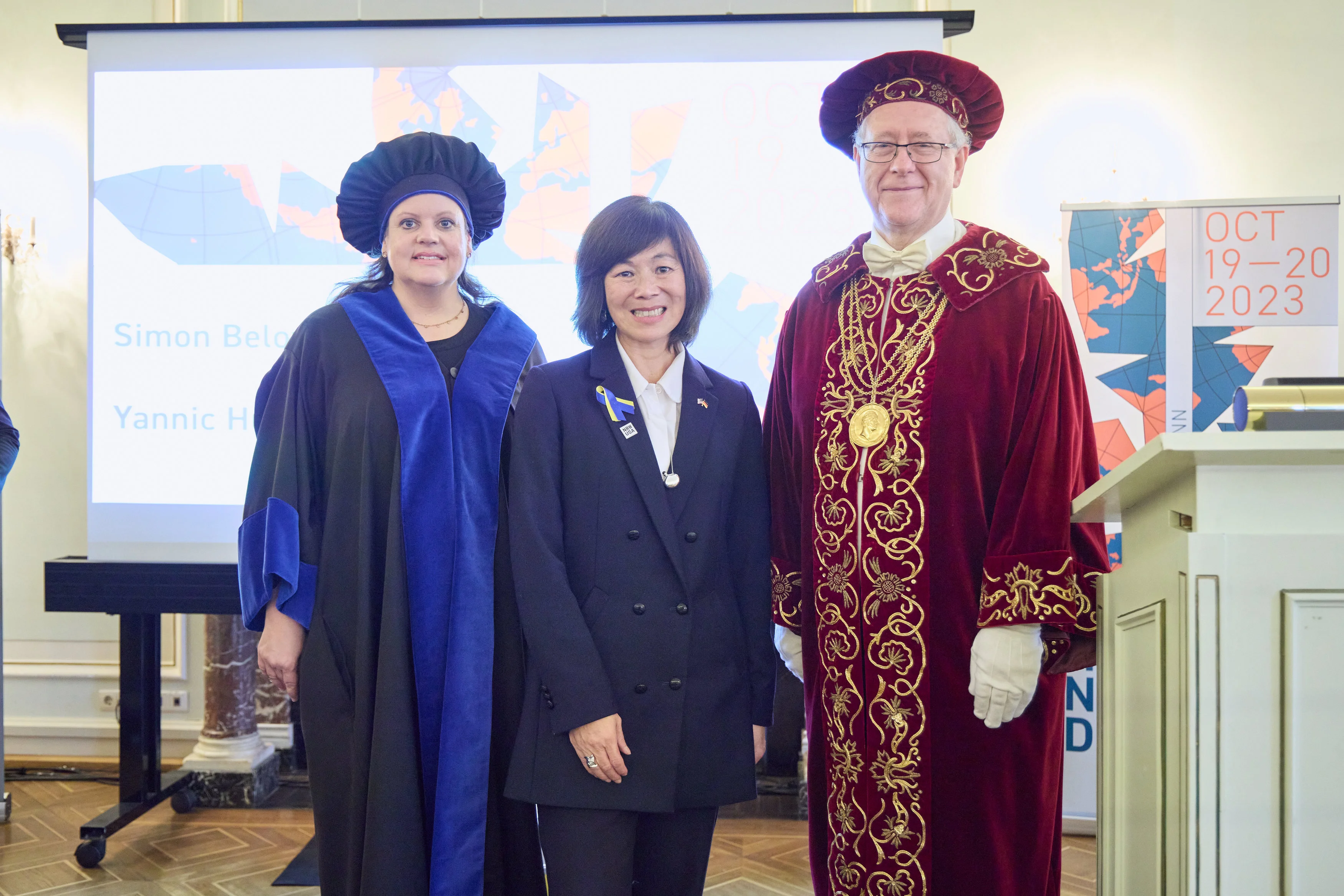 Die US-Generalkonsulin in Düsseldorf, Pauline Kao (Mitte), mit Rektor Michael Hoch und Prorektorin Birgit Ulrike Münch.