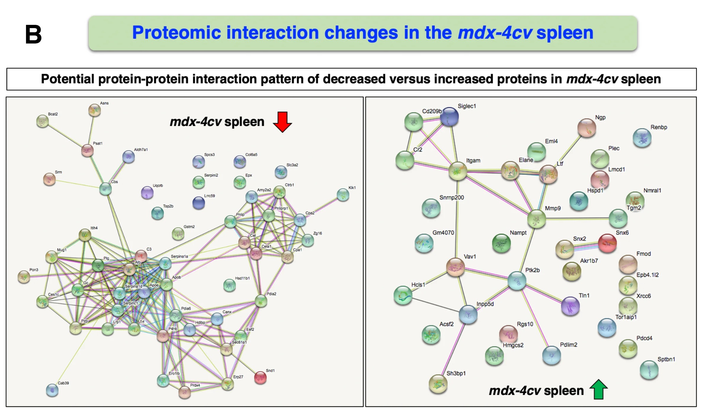 über die potentiellen Protein-Protein-Interaktionsmuster bei verminderten (links) und erhöhter (rechts) Konzentration von Proteinen in der Milz von Duchenne-Mäusen.