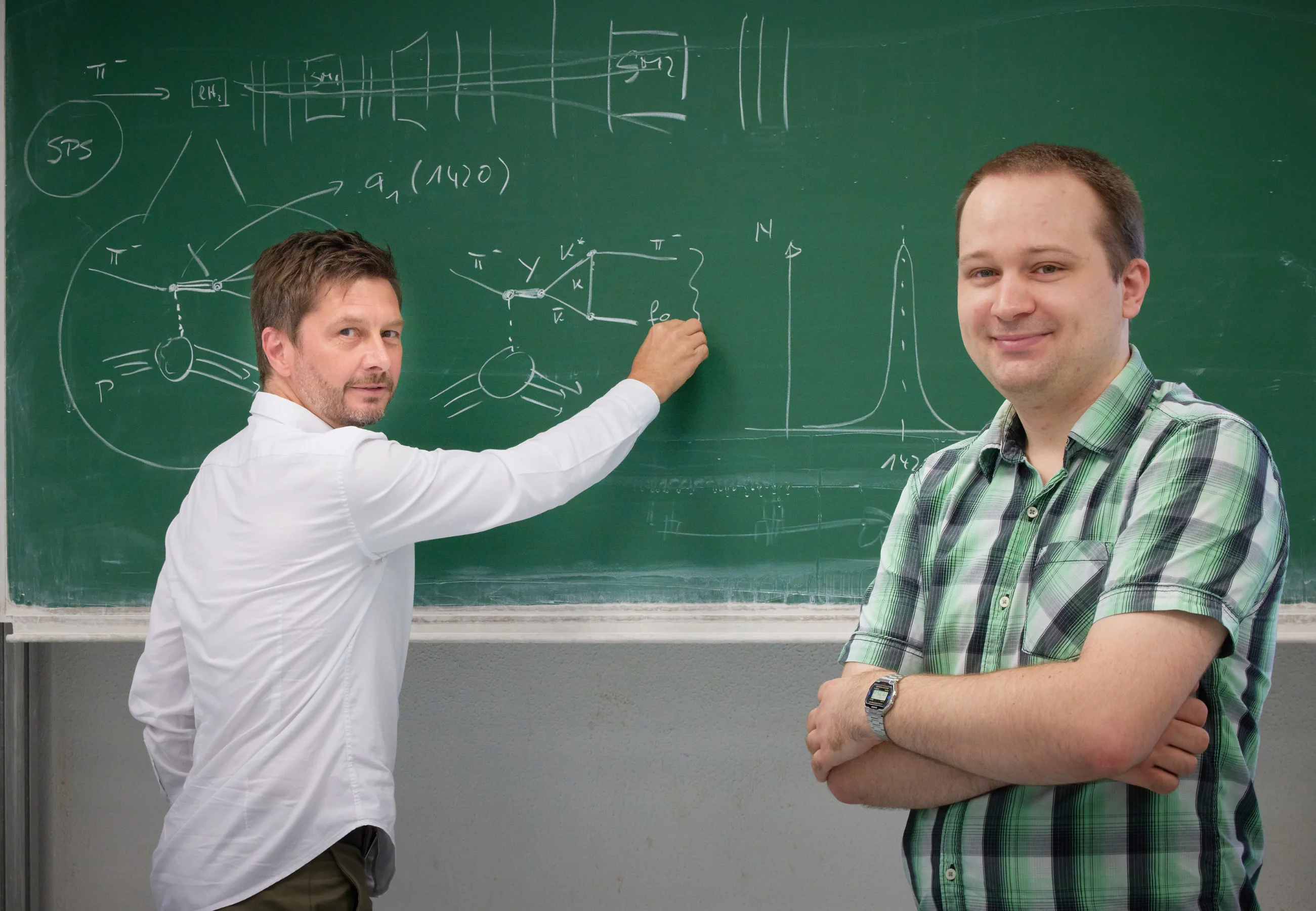 Prof. Dr. Bernhard Ketzer (links) und Mathias Wagner (rechts) erläutern einen speziellen Prozess bei der Streuung von hochenergetischen Pionen an Protonen, die sogenannte Dreieckssingularität.