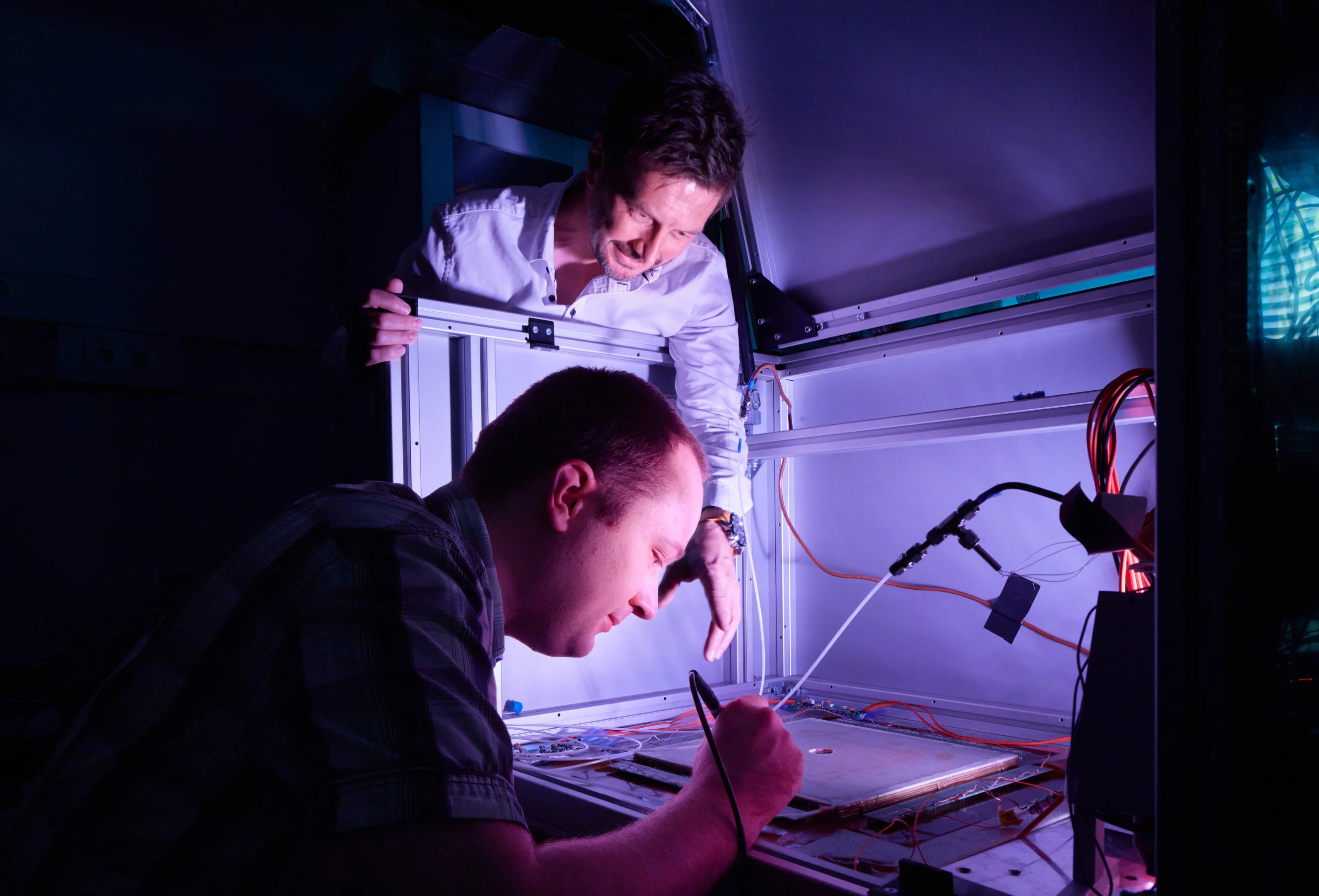 von Mathias Wagner (unten) am gasgefüllten, mikrostrukturierten Spurdetektor: Das Team von Prof. Dr. Bernhard Ketzer (oben) entwickelte das Messinstrument.
