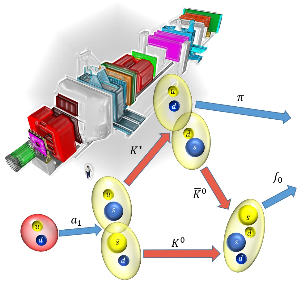 Das in der Kollision erzeugte Teilchen a1 zerfällt in zwei Teilchen K* und K-quer. Diese wechselwirken miteinander und erzeugen so die beiden Teilchen pi und f0.