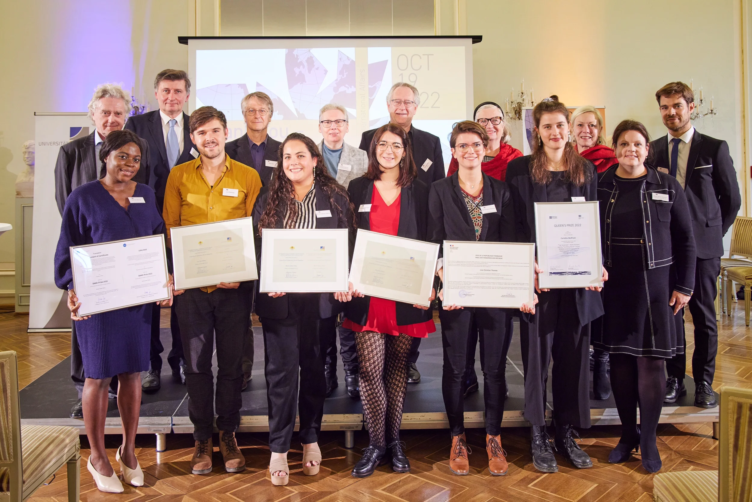 sind herausragende Nachwuchswissenschaftlerinnen und -wissenschaftler mit den Staatspreisen ausgezeichnet worden. Untere Reihe v.l.n.r.: Relindis Ebesoh Nkeng, Luis Padberg, Marien Salinas Valera, Alba Iglesias Martin, Lisa Christine Thomas, Carlotta Wolfram und Prorektorin Prof. Dr. Birgit Ulrike Münch. Obere Reihe v.l.n.r.: Paul Smith (Direktor des British Council Deutschland), Prof. Dr. Walter Bruchhausen (Abteilung für „Global Health“, ukb), Dr. Klaus Birk (DAAD), Prorektorin Prof. Dr. Irmgard Förster, Rektor Prof. Dr. Dr. h. c. Michael Hoch, Prof. Dr. Mechthild Albert (Romanistik, Universität Bonn), Dr. Monika Wehrheim (Romanistik, Universität Bonn) und Matthieu Osmont (Direktor des Institut français, Bonn).