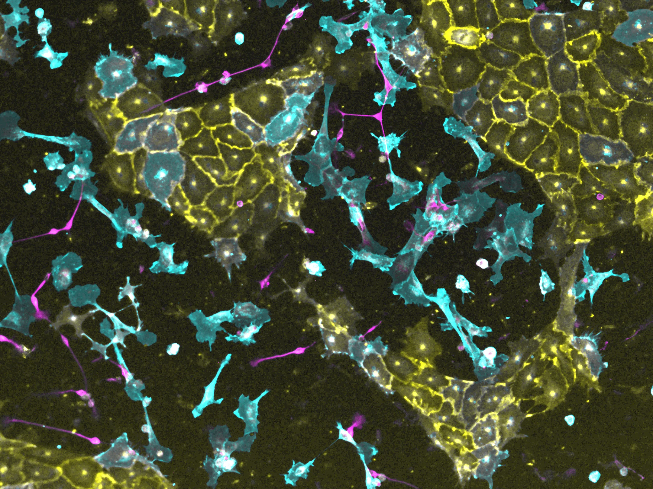 in Gefäß-, Nerven- und Bindegewebszellen: drei transgene iPS-Linien, in denen jeweils ein anderer Transkriptionsfaktor aktivierbar ist, wurden gemischt und zu einem definierten synthetischen Gewebe innerhalb von vier Tagen induziert. Gefäßzellen sind gelb, Nervenzellen magenta und Bindegewebszellen blau angefärbt.