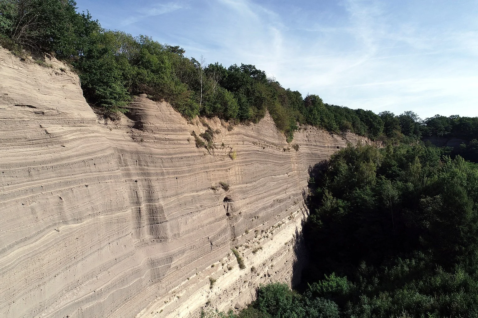 der Aufschluss Wingertsbergwand, eine lange Bims- und Tuffwand, die durch den Abbau vulkanischer Rohstoffe freigelegt wurde.