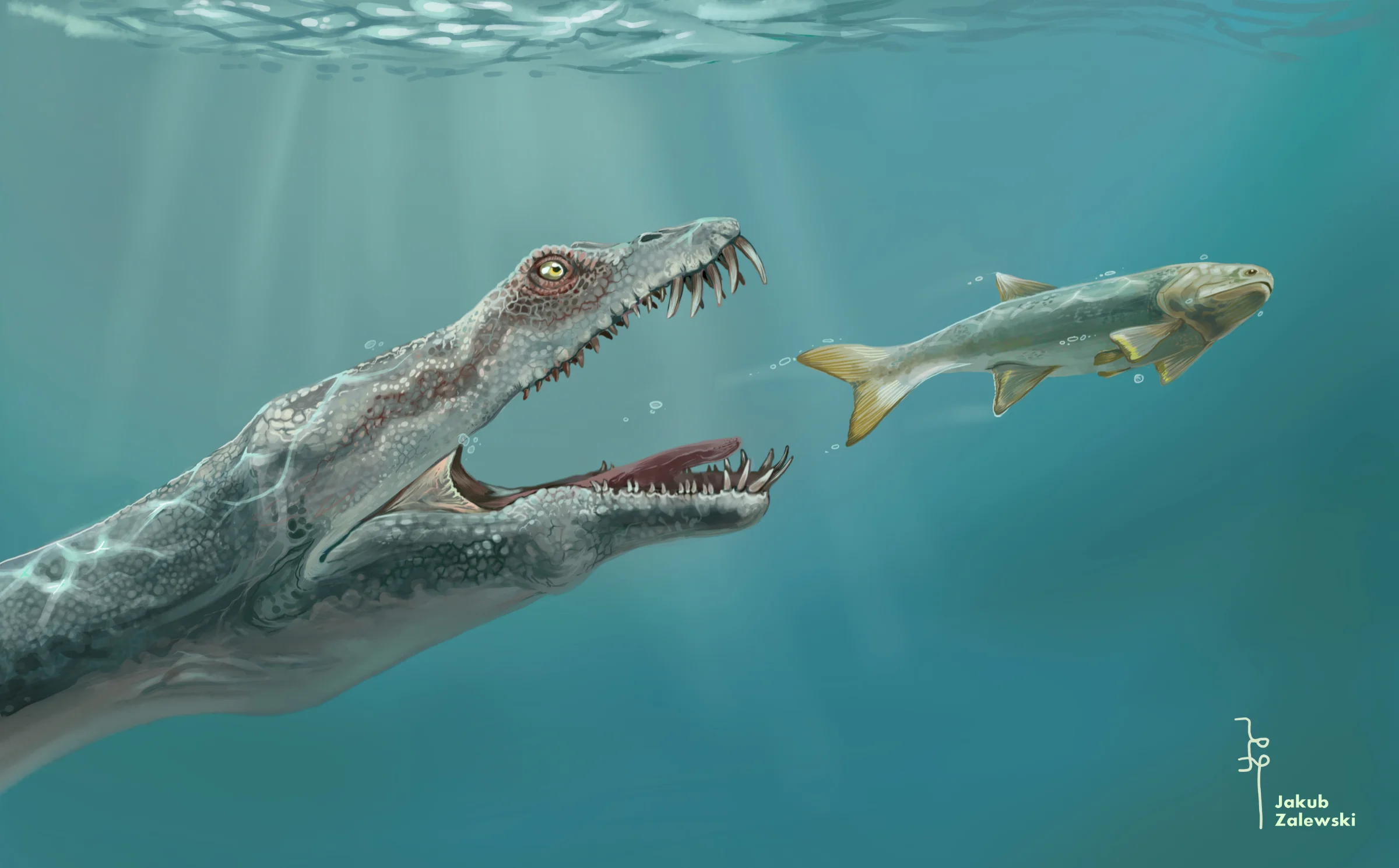 von Robbengröße bei der Fischjagd. Die Abbildung zeigt eine ausgeprägte Verdickung am Unterkiefer, bei der es sich um eine verheilte Fraktur des Knochens handelt.