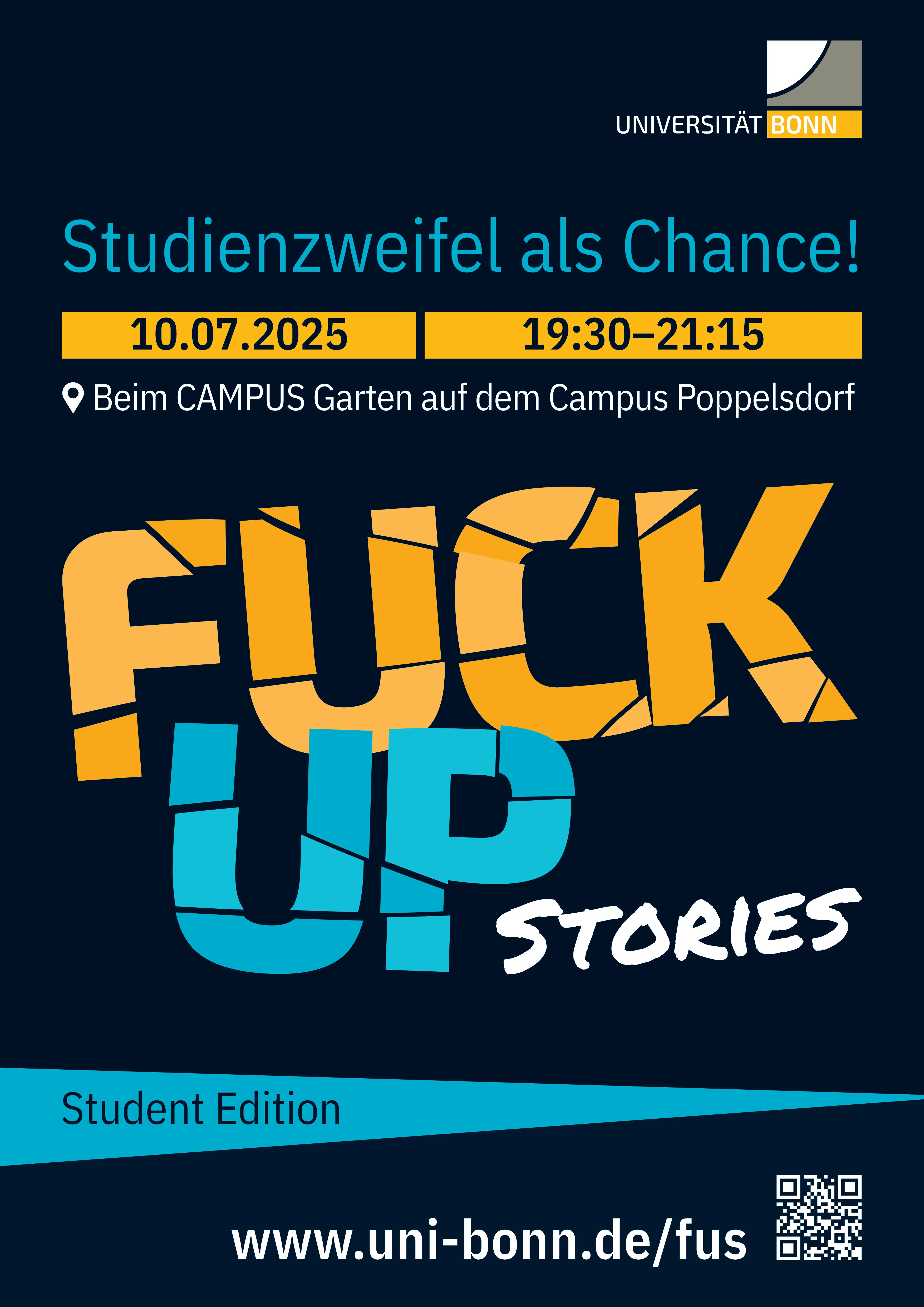 Gesellschaftlicher Druck, falschen Studiengang gewählt, überfordert oder sogar zwangsexmatrikuliert? Studienzweifel gehören inzwischen zur Tagesordnung. Das beweisen auch in diesem Jahr mutige Speaker*innen, die bei den Fuck Up Stories - Student Edition am 10.07.2025 von 19:30-21:15 Uhr von ihren gescheiterten Studienerlebnissen, geplatzten Karriereträumen und der Zeit danach berichten. Herzlich eigeladen sind alle Interessierten um sich die Geschichten unserer Speaker*innen anzuhören.