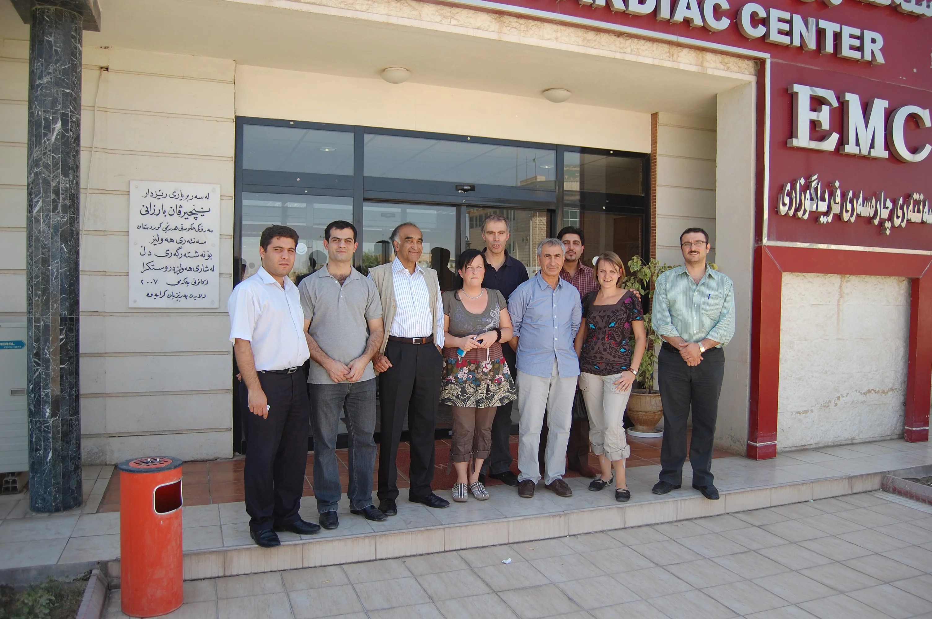 Das Bonner Team vor dem Hawler Cardiac-Center: Professor Murday (3. v li), Anja Henschler (4. v li), Professor Breuer (5. v li), Dr. Bahman Esmailzadeh (6. v li) und Simone Ross(8. v li);