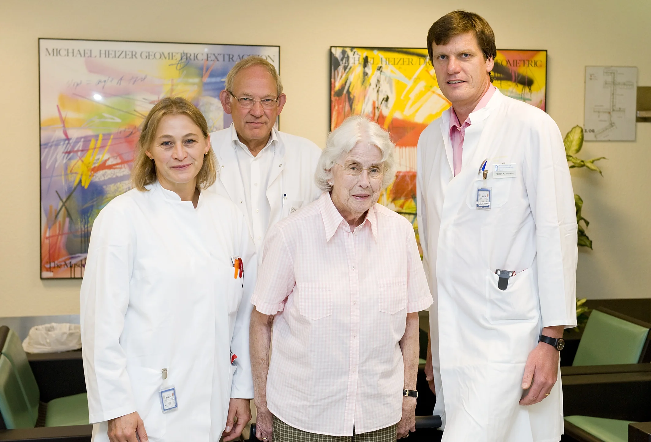 (v. li.): Gefäßchirurgin Dr. Frauke Verrel, Professor Dr. Andreas Hirner (Direktor der Universitäts-Chirurgie), Maria K. und Privatdozent Dr. Kai Wilhelm.