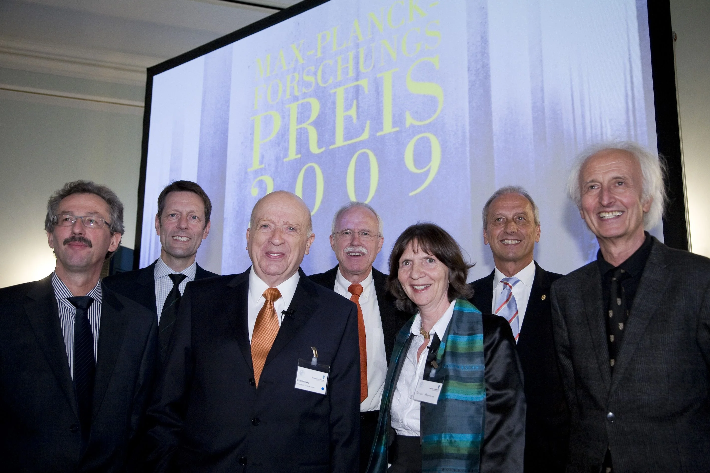 Foto (v.l.n.r.): Rektor Jürgen Fohrmann, Humboldt-Generalsekretär Georg Schütte, Preisträger Karl Galinsky, Staatssekretär Frieder Meyer-Krahmer, Preisträgerin Aleida Assmann, Max-Planck-Präsident Peter Gruss und Humboldt-Präsident Helmut Schwarz.