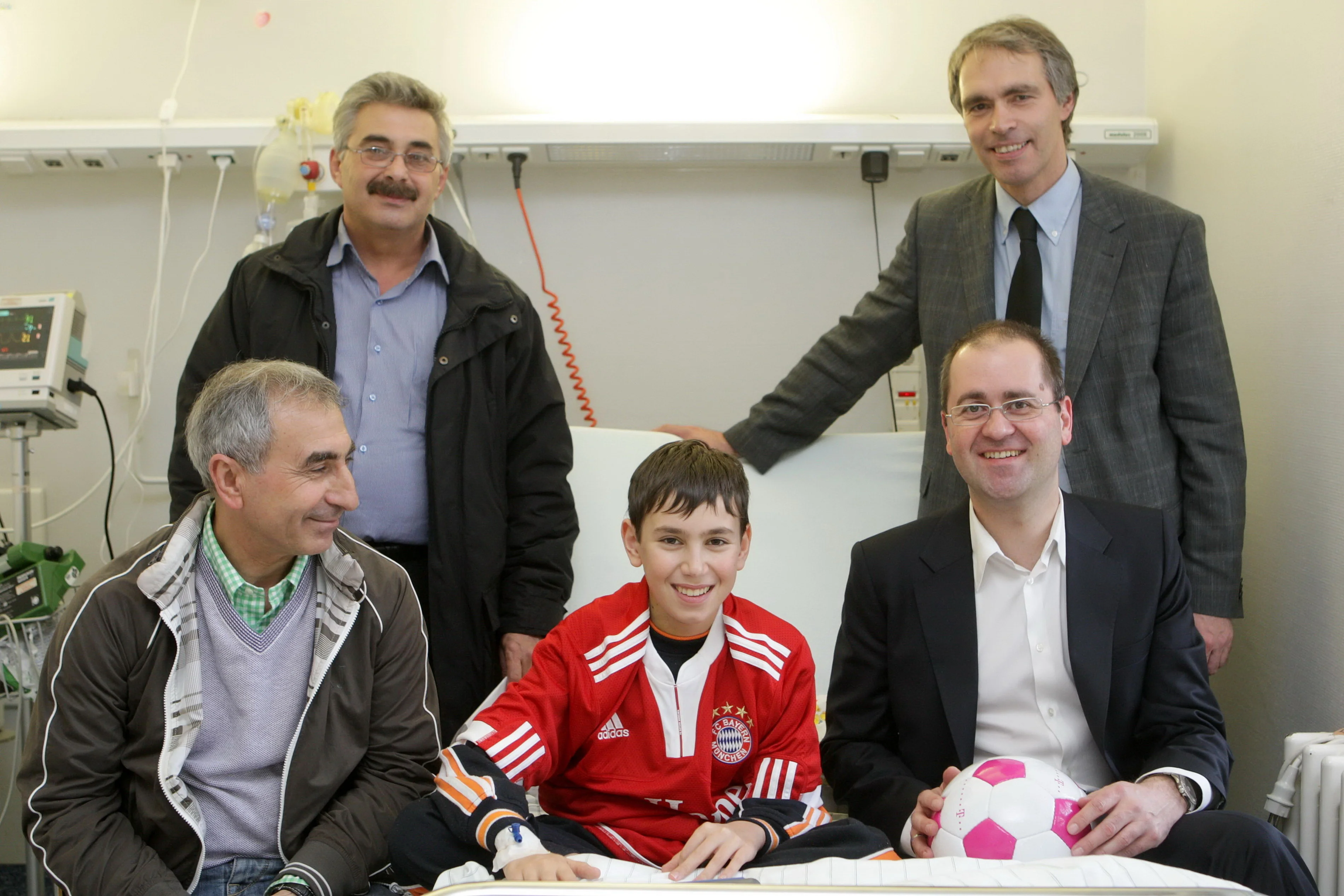 Zheyar freut sich über seinen neuen Fußball und sein Fußball-Trikot: (vorne; v. li) Dr. Bahman Esmailzadeh, Zheyar, Michael Schuld, Leiter Vertriebs- und Servicemarketing Deutsche Telekom; (hinten; v. li) Zheyars Vater Jasim und Professor Dr. Johannes Breuer;