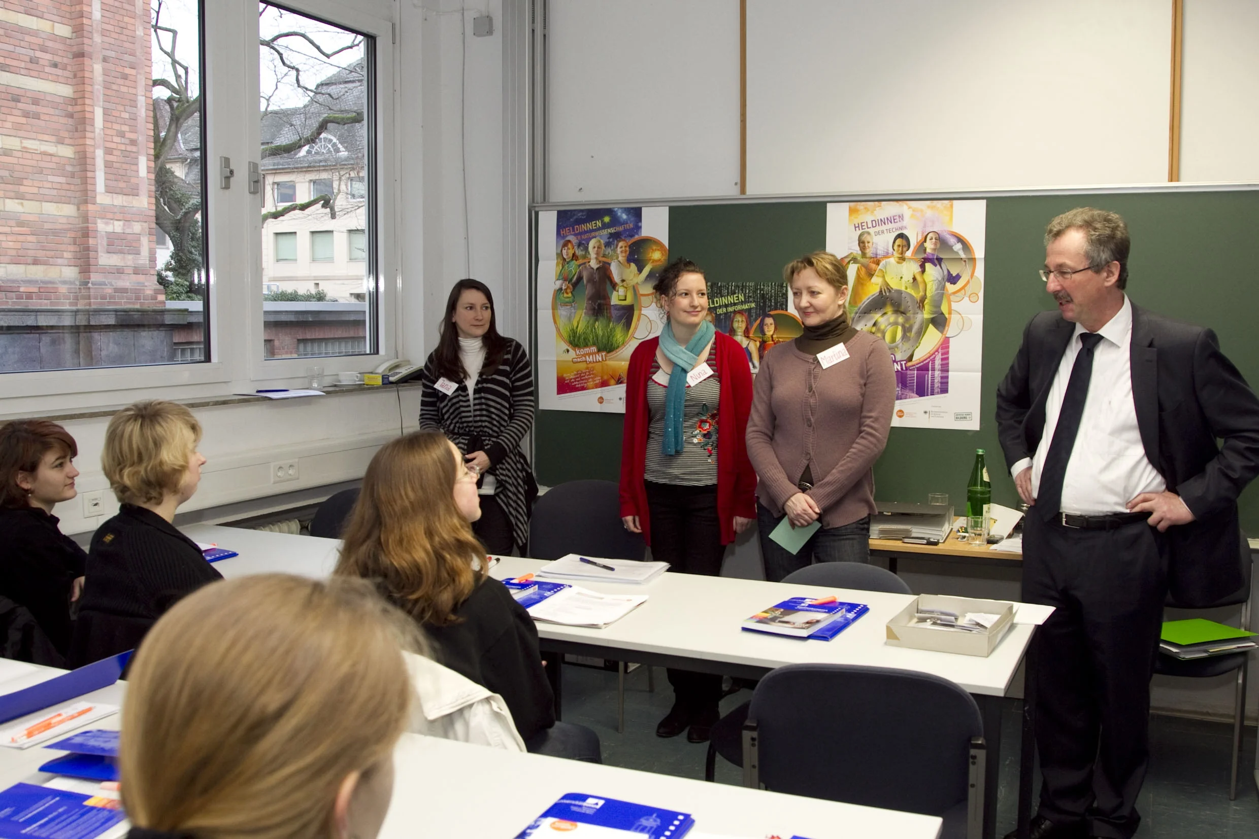 Chefsache: Rektor Prof. Dr. Jürgen Fohrmann (re.) begrüßt persönlich die Teilnehmerinnen des tasteMINT-Assessments.