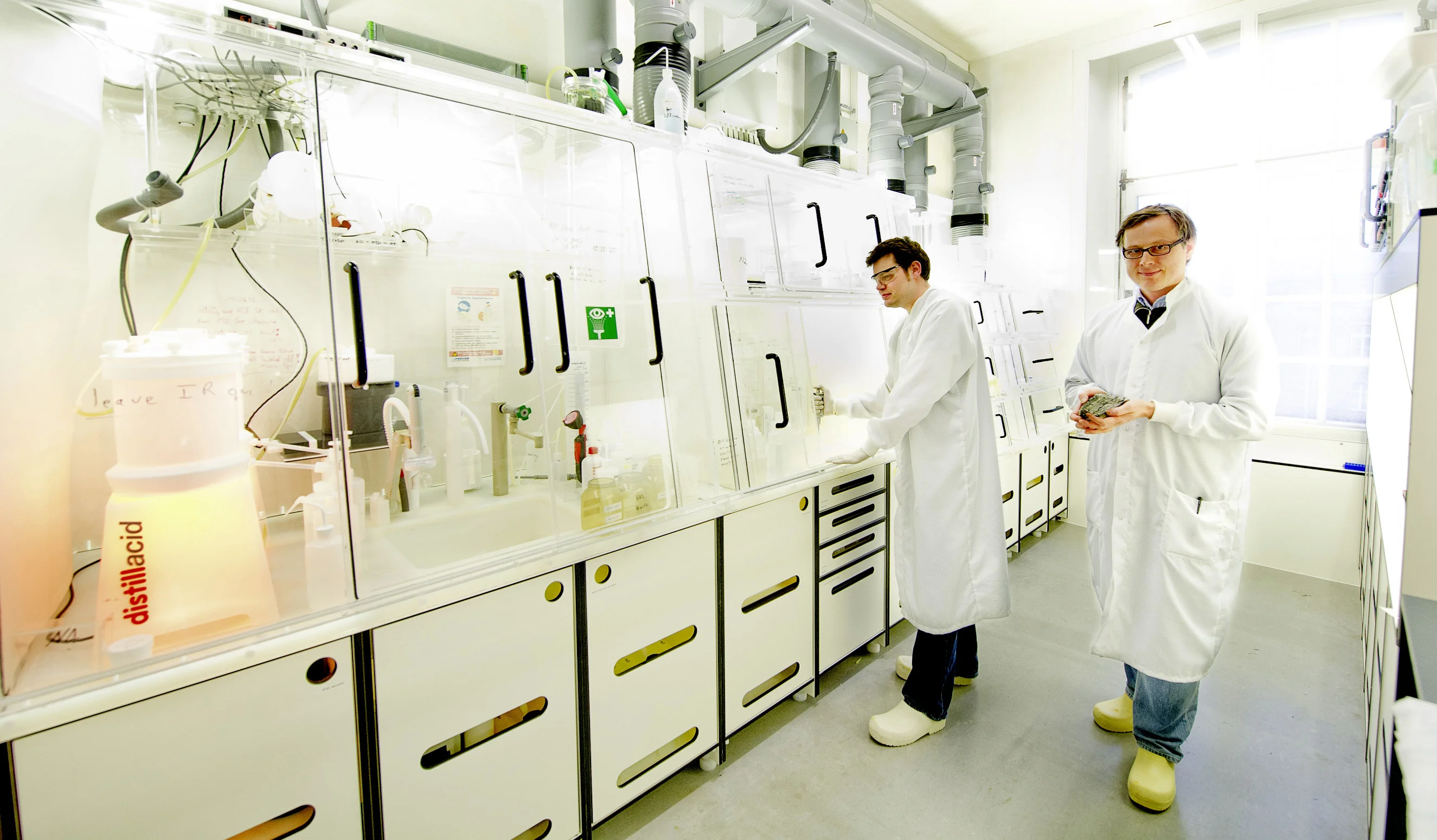 Privatdozent Dr. Thorsten Nagel (rechts) und Dr. J. Elis Hoffmann mit den ältesten Gesteinen im Labor.