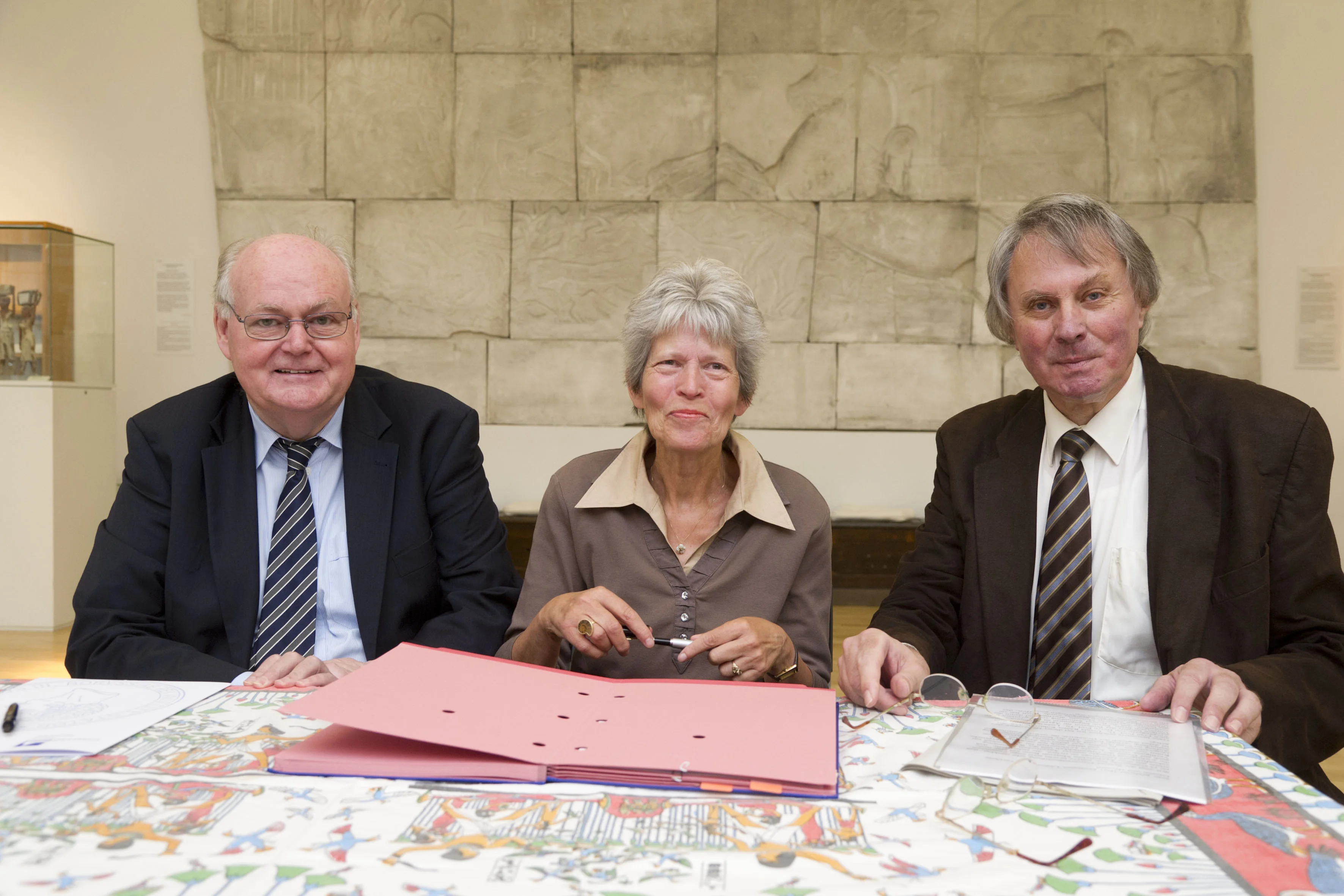 Prof. Dr. Wolfgang Löwer, Vorstandsvorsitzender der Universitäts-Stiftung, sowie die Stifter Ursula und Karl-Heinz Preuß (von links) im Ägyptischen Museum der Universität Bonn.