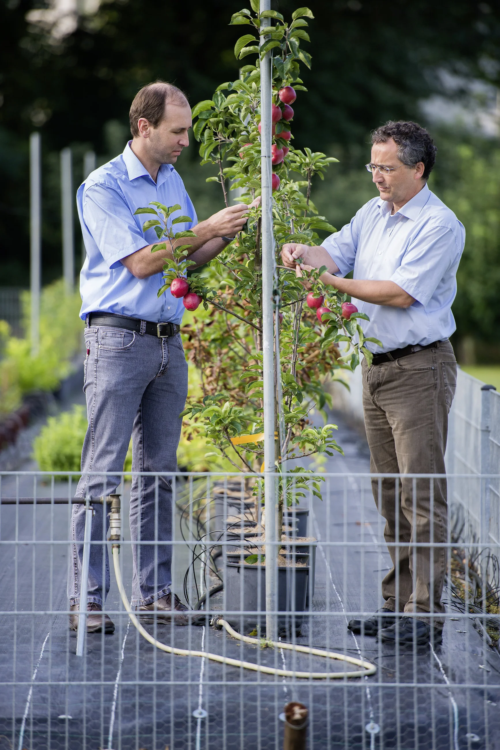 Dr. Mauricio Hunsche (links) und Dr. Jürgen Burkhardt an einem Apfelbaum der Abteilung Gartenbauwissenschaft der Universität Bonn.
