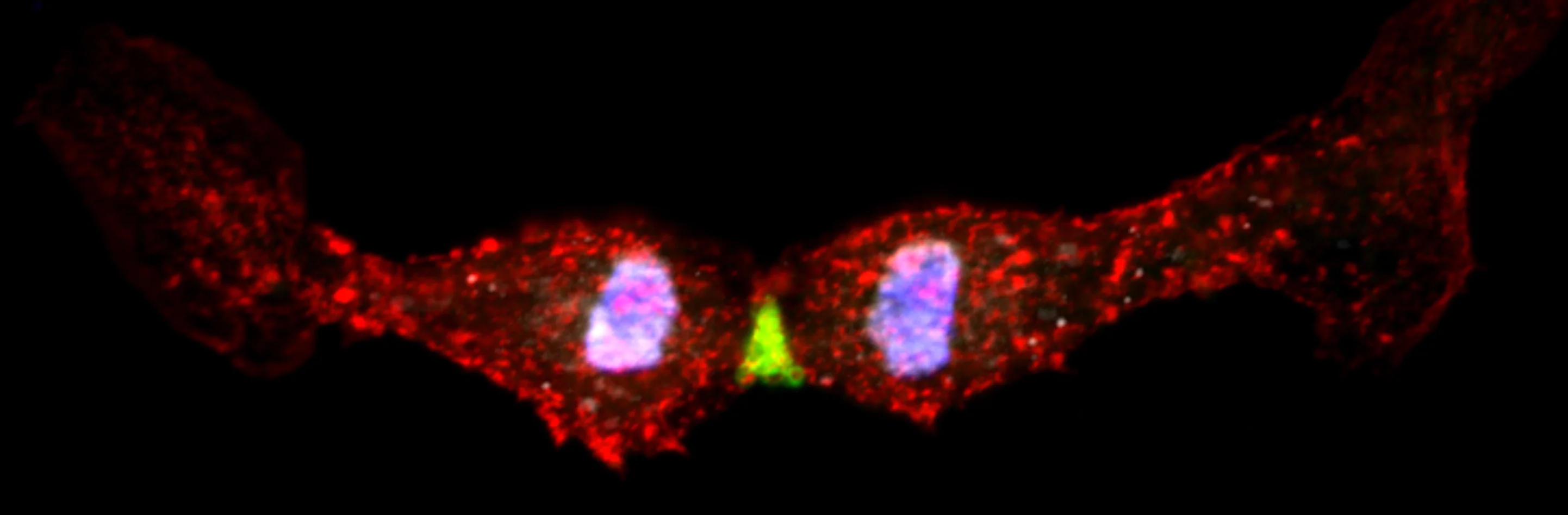 Der Mittelkörper ist durch das GFP-Anillin-Signal grün markiert. Zu sehen ist eine Immunfärbung gegen Alpha-Aktinin zu Erkennung von Herzmuskelzellen (rot) und gegen Ki-67 (Kern-Lokalisation, weiß) als Proliferationsmarker.