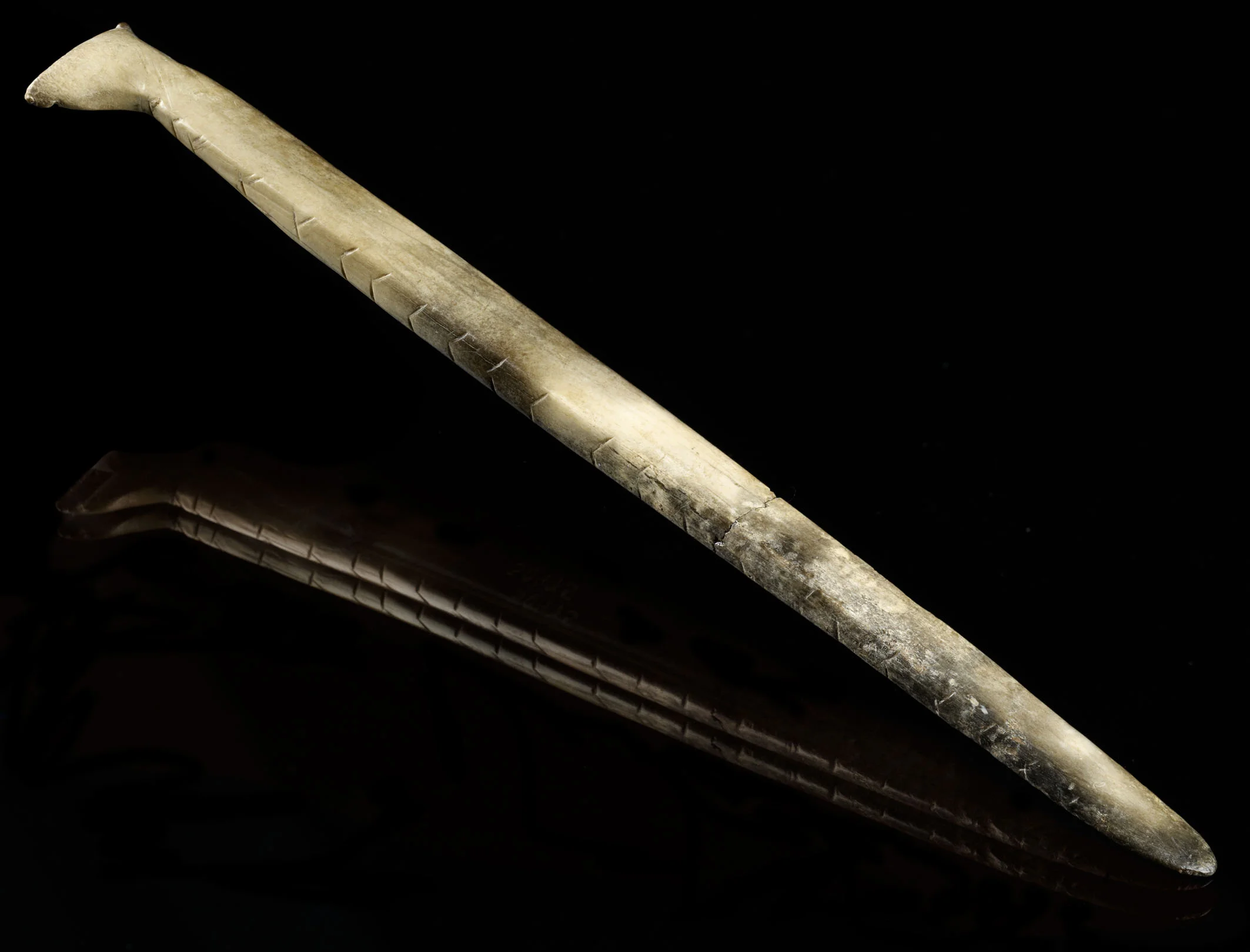 Knochenstab aus dem Doppelgrab von Oberkassel mit Tierkopfverzierung.