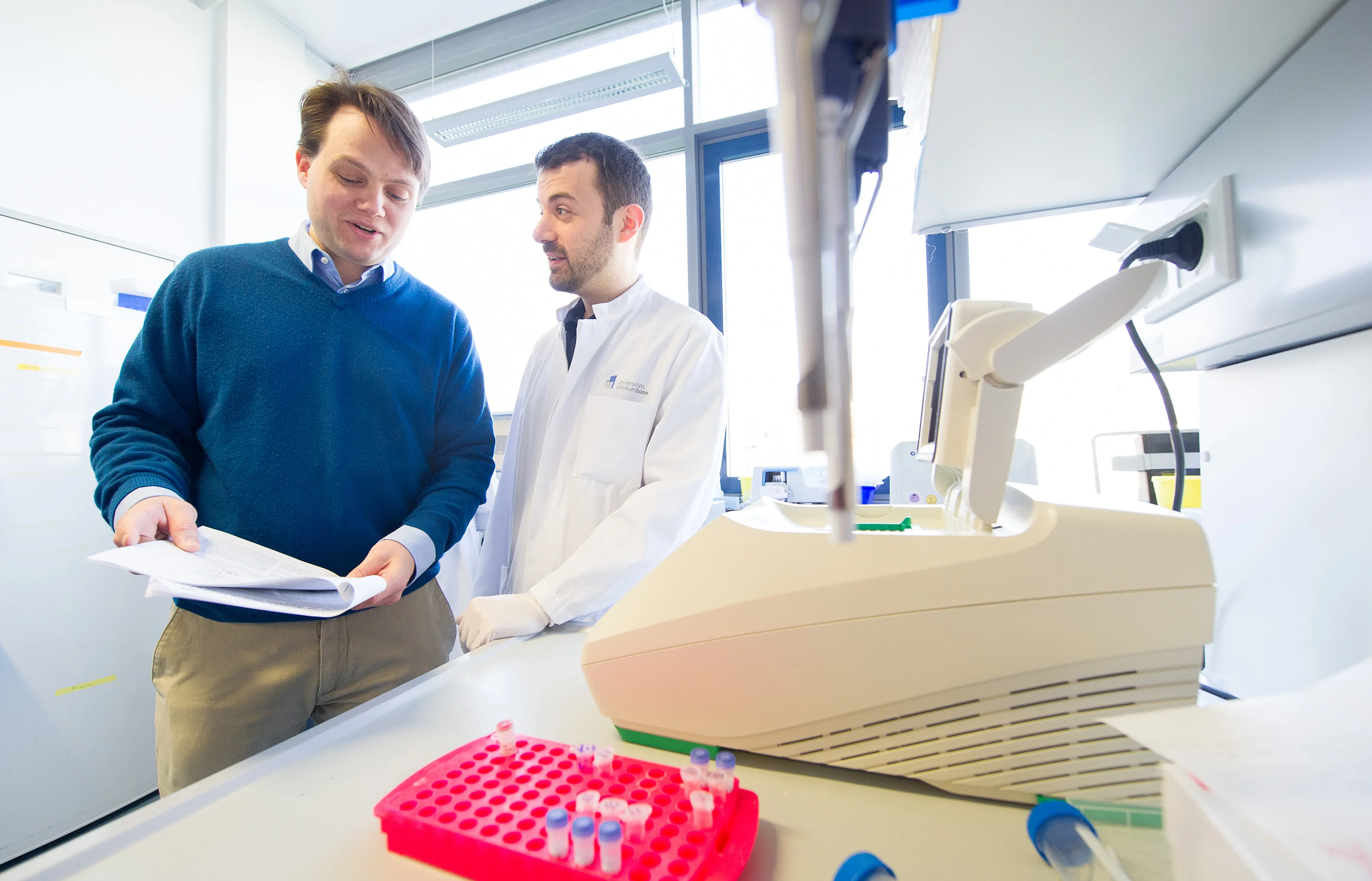 Prof. Dr. Veit Hornung (links) und Taner Cavlar vom Institut für Klinische Chemie und Klinische Pharmakologie des Universitätsklinikums Bonn haben die Wirkweise eines längst vergessenen Wirkstoffkandidaten entschlüsselt.