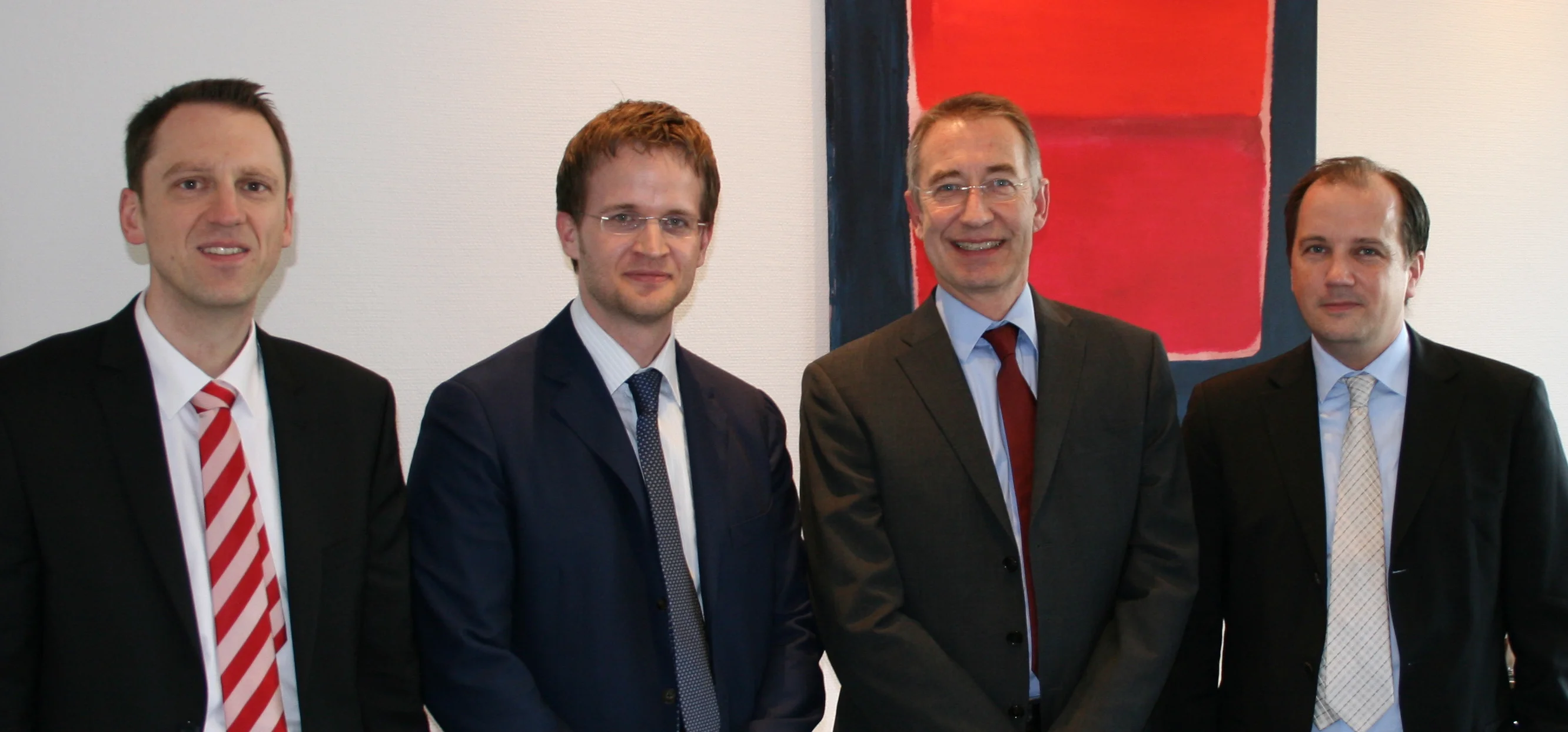 Die beiden Projektleiter Prof. Dr. Björn Scheffler (re) und PD Dr. Martin Glas (2. v. li) mit dem am Antrag beteiligten Validierungspartner Prof. Dr. Holger Fröhlich (Bonn-Aachen International Center for IT, Algorithmic Bioinformatics; li) und dem im BMBF-Förderprogramm zur Seite gestellten Innovationsmentor Prof. Dr. Hanno Wild (Bayer Pharma AG; 2. von rechts);