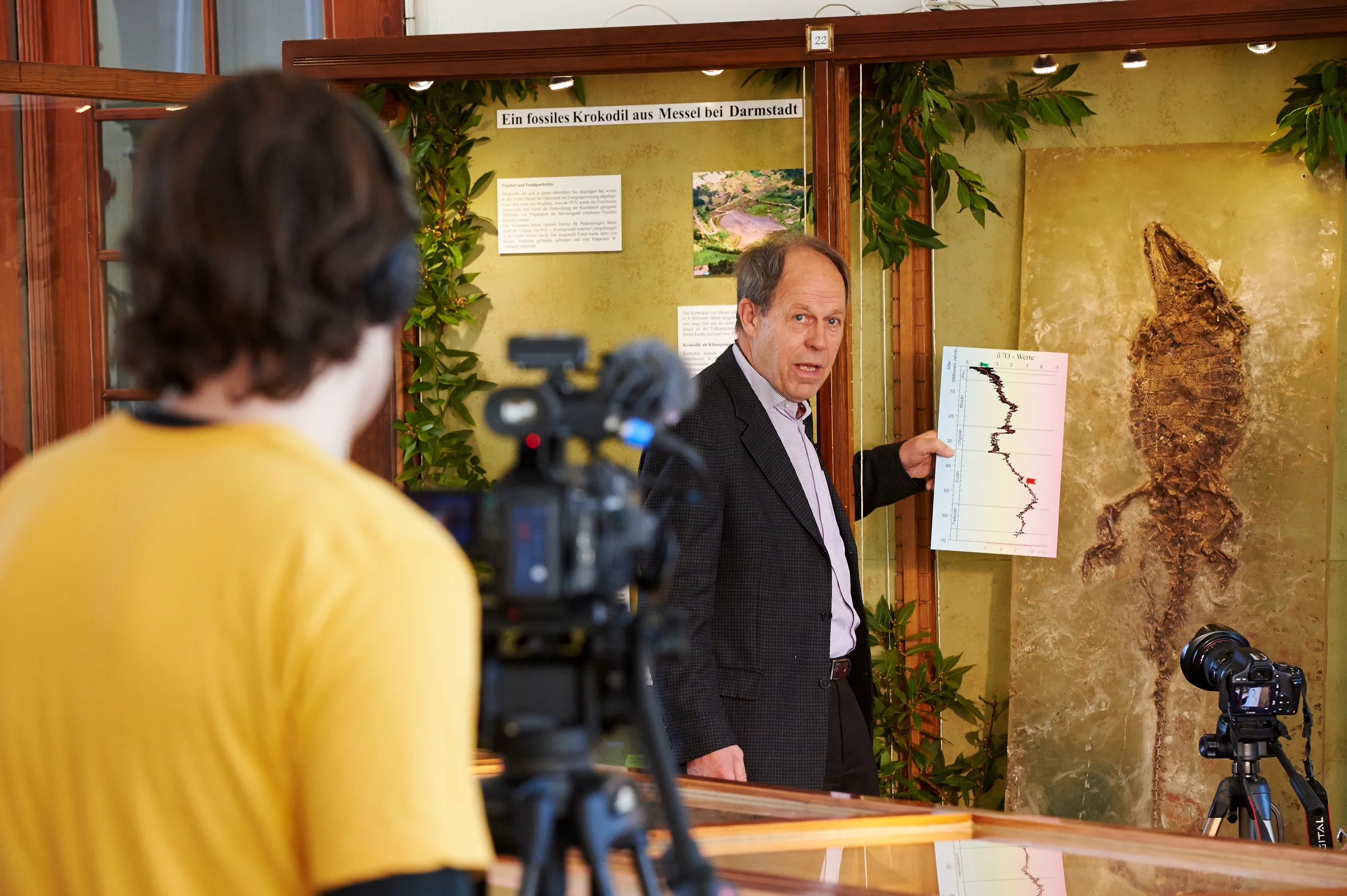 Prof. Dr. Wighart von Koenigswald vor dem fossilierten Krokodil.