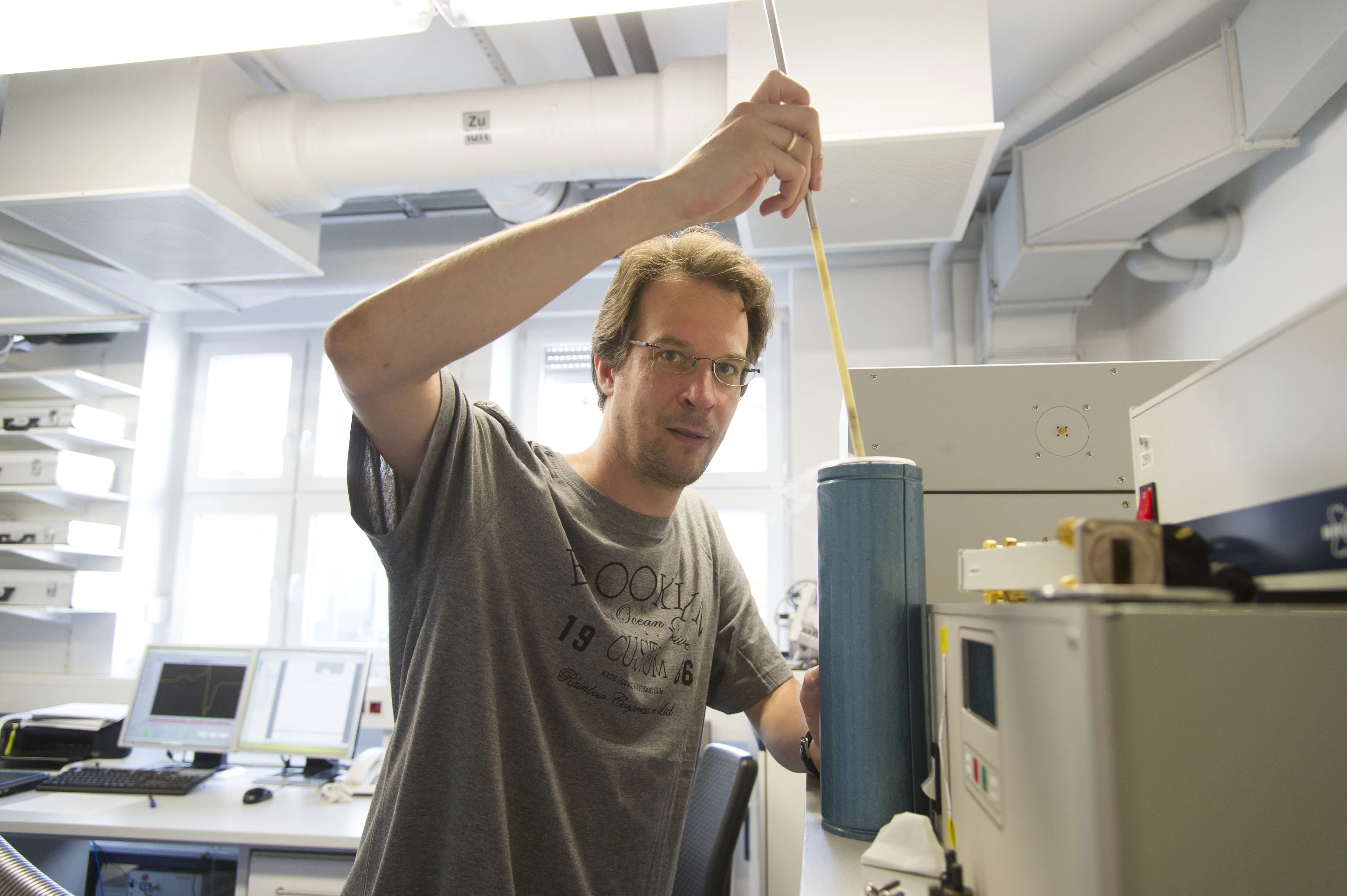 Prof. Dr. Olav Schiemann vom Institut für Physikalische und Theoretische Chemie der Universität Bonn bei der Probenüberführung zur PELDOR-Messung.