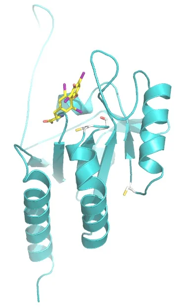 und das Hormon Thyroxin (gelb) mit seinen vier Jod-Atomen (violett), wovon eines im Verlauf der Reaktion spezifisch entfernt wird. Die drei farbig markierten Aminosäuren sind am katalytischen Mechanismus des Enzyms beteiligt.