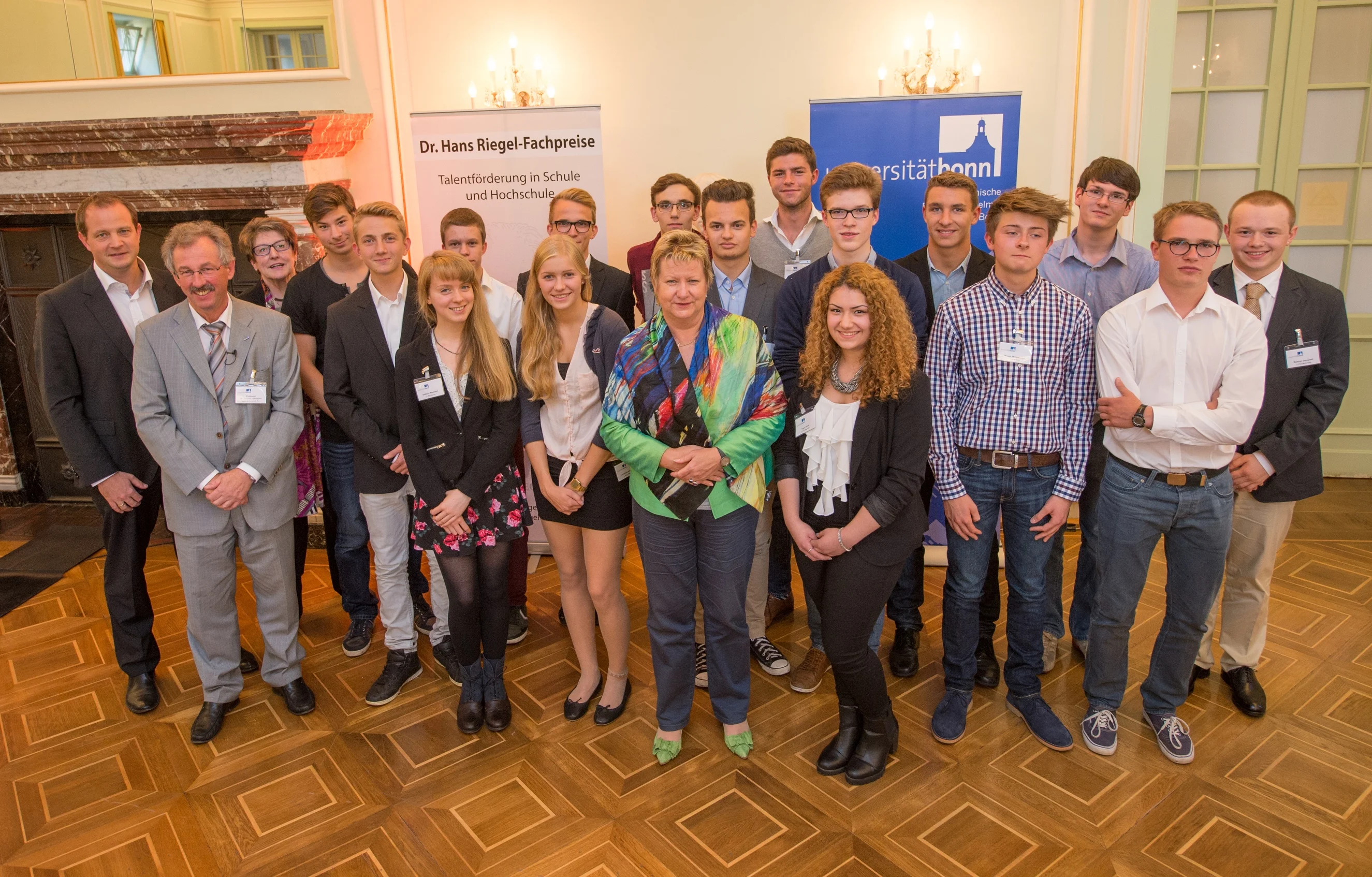 Vordere Reihe, von Links: Prof. Dr. Jürgen Fohrmann (Rektor Universität Bonn), Milan Louis Schröder (1. Platz Physik), Isabelle Neumann (2. Platz Chemie), Johanna Spengler (1. Platz Geographie), Sylvia Löhrmann (Schulministerin des Landes NRW), Tugce Aslan (3. Platz Geographie), Manus Wittenhorst (3. Platz Biologie), Stefan Koch (1. Platz Mathematik); hintere Reihe, von Links: Marco Alfter (Geschäftsführendes Vorstandsmitglied Dr. Hans Riegel-Stiftung), , Prof. Dr. Ingeborg Henzler (Vorstandsmitglied Dr. Hans Riegel-Stiftung), Merten Mallwitz ( 2. Platz Physik), Johannes Boch (3. Platz Physik), Michael Scholkemper (1. Platz Informatik), Christian Windeck (2. Platz Informatik), Philipp Krämer (3. Platz Chemie), Leonard Richter (2. Platz Biologie), Julius Müller-Kassner (1. Platz Biologie), Florian Konstantin Wittich (3. Platz Mathematik), Jonas Sommer (1. Platz Chemie), Damian Demarest (2. Platz Mathematik) |