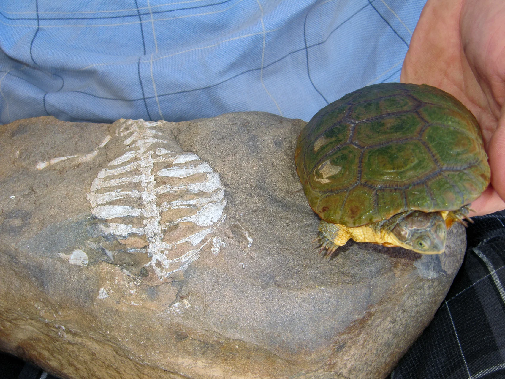 Links das rund 260 Millionen Jahre alte Fossil von Eunotosaurus africanus aus Südafrika und eine Schwarze Pelomedusenschildkröte (Pelusios niger). Vorläufer und moderne Schildkröte verfügen beide über das besondere Atmungssystem, das ohne Rippen auskommt.