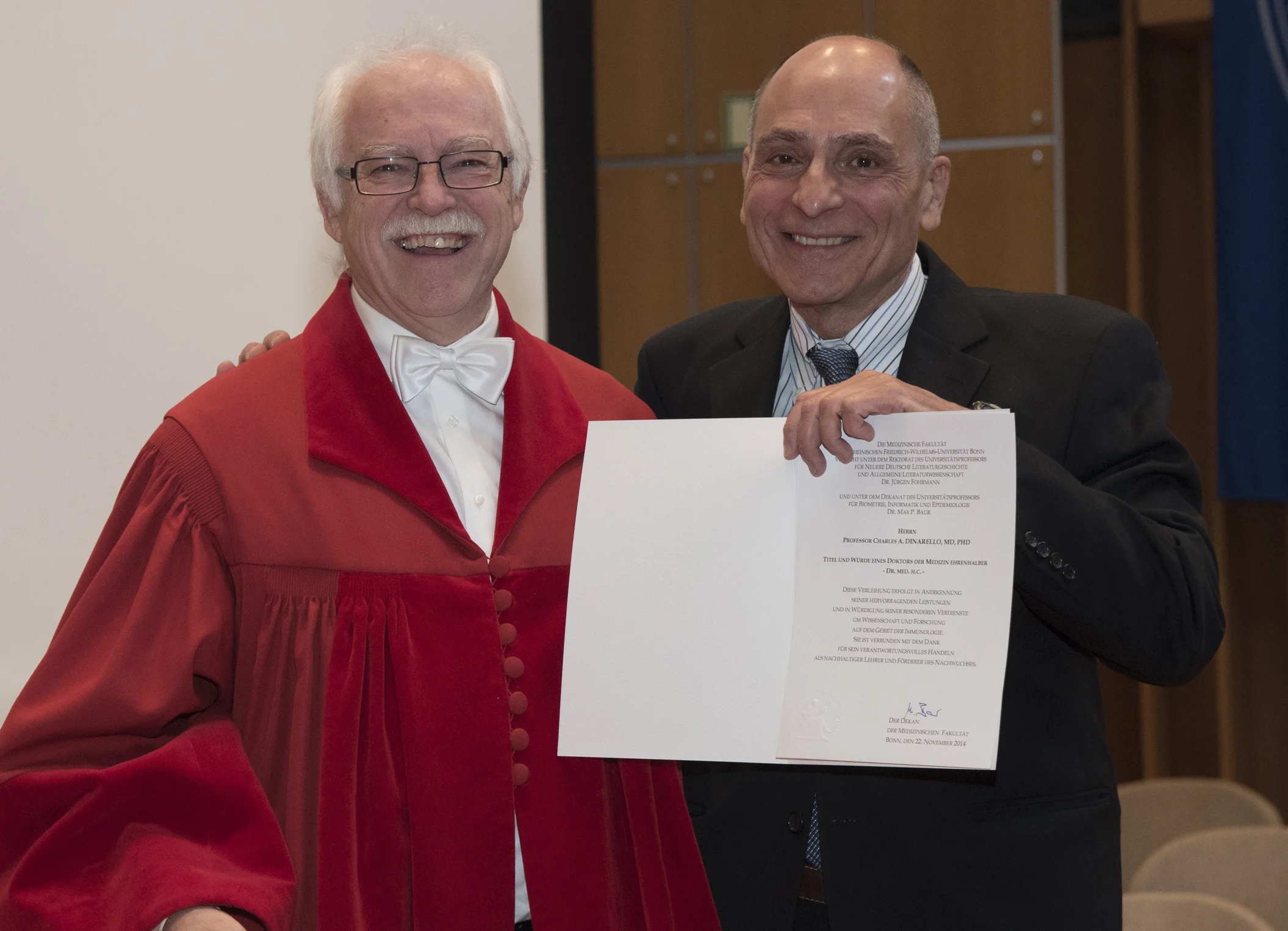 Prof. Max P. Baur, Dekan der Medizinischen Fakultät der Universität Bonn, und Prof. Dr. Charles A. Dinarello, Immunologe an der Universität Colorado und an der Radboud-Universität Nijmegen (von links).