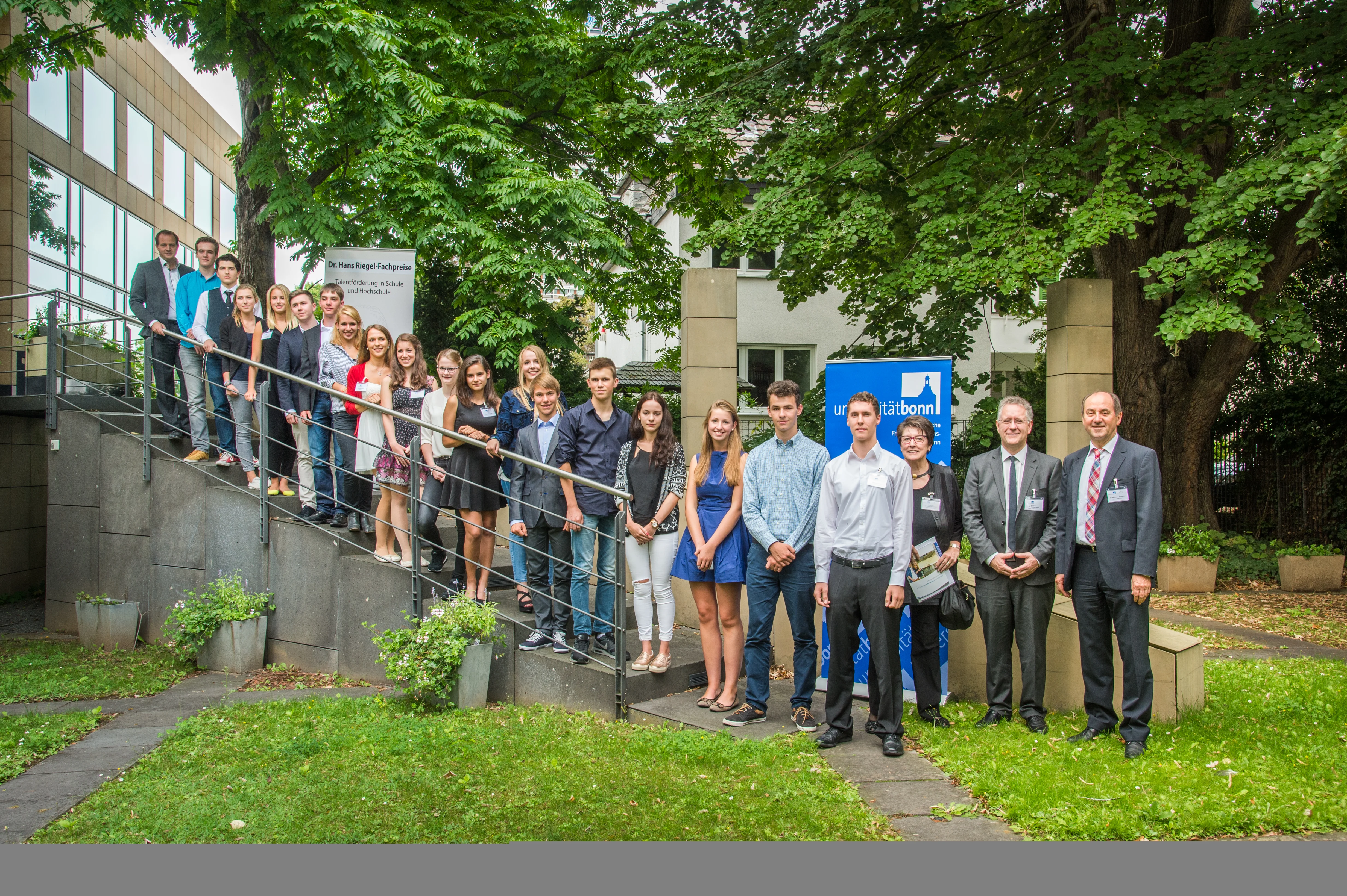 Von links nach rechts: Marco Alfter (Geschäftsführer Dr. Hans Riegel-Stiftung), Fabian Quack (3. Platz Informatik), Rafael Materla (1. Platz Informatik), Anna Buchner (2. Platz Informatik), Sonja Rombach (2. Platz Physik), Johannes Götz (1. Platz Physik), Jona Krahl (3. Platz Physik), Inga Hagedorn (2. Platz Geographie), Eva Meierhenrich (3. Platz Mathematik), Anika Händeler (1. Platz Geographie), Sarah Kirrinnis (1. Platz Mathematik), Sarah Saresadeh (3. Platz Chemie), Tabea Kurbacher (1. Platz Chemie), Fabian Brensing (2. Platz Chemie), Max Richter (3. Platz Biologie), Christina Durwen (3. Platz Geographie), Marie Werkhausen (1. Platz Biologie), Benedict Wolf (2. Platz Biologie), Michael Lebed (2. Platz Mathematik), Prof. Dr. Ingeborg Henzler (Vorstandsmitglied Dr. Hans Riegel-Stiftung), Prof. Dr. Michael Hoch (Rektor der Universität Bonn), Dr. Reinhard Schneider (Vorstandsvorsitzender der Dr. Hans Riegel-Stiftung).