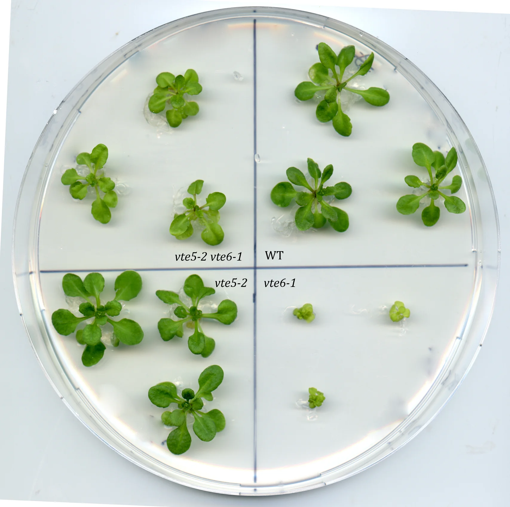 haben in der Ackerschmalwand gezielt bestimmte Gene ausgeschaltet. Im Vergleich zum Wildtyp (WT, rechts oben) wächst die Pflanze mit ausgeschaltetem VTE6-Gen (vte6-1, rechts unten) deutlich langsamer.