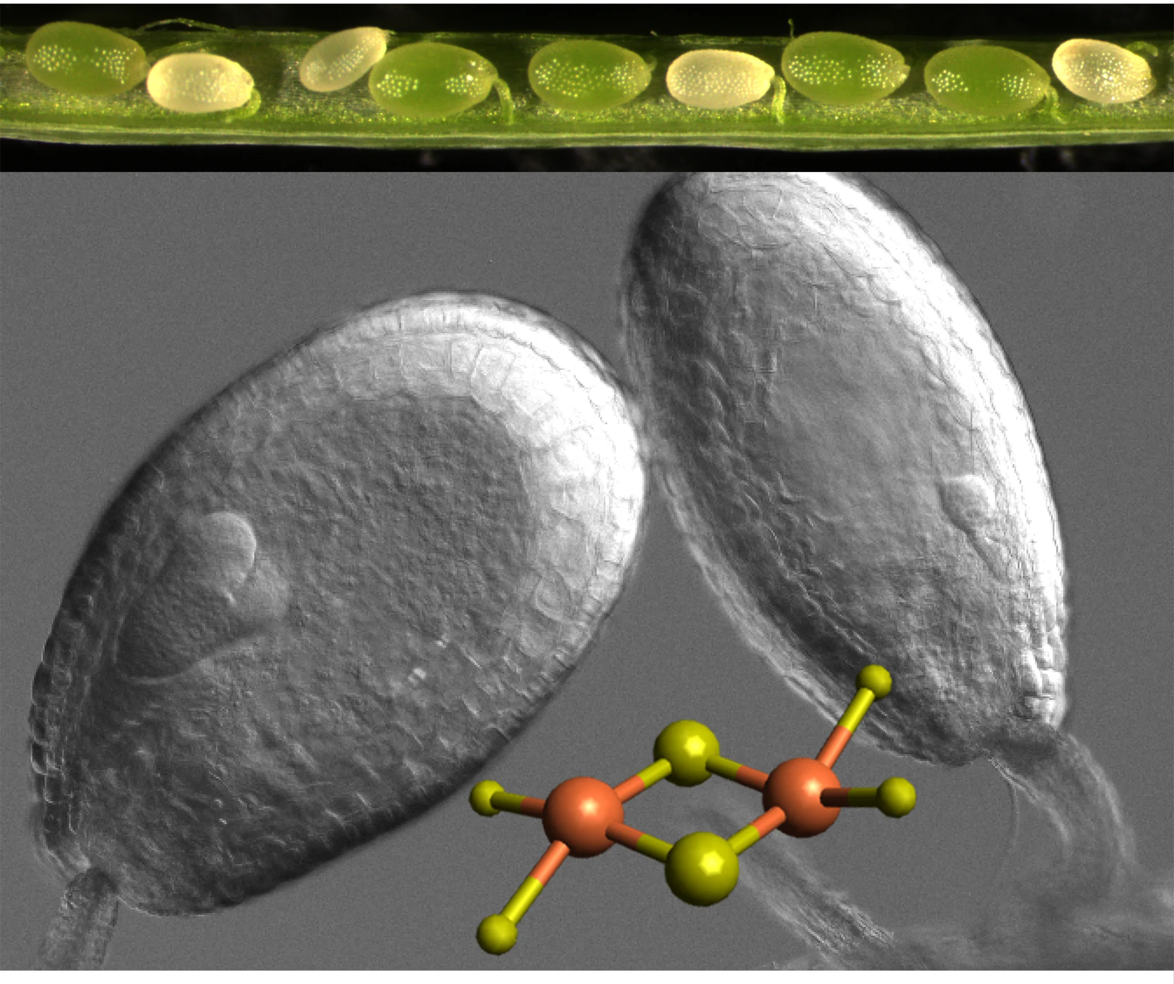 in pflanzlichen Mitochondrien führt dazu, dass die Pflanzen schon während der Bildung ihrer Samen vorzeitig absterben. Oben: Geöffnete Schote einer Glutaredoxin S15- Arabidopsis-Mutante. Die weißen Samen sterben ab. Unten: Zwei Samenanlagen mit sich entwickelndem Embryo (links: Wildtyp; rechts: nicht lebensfähige Mutante). Überlagertes Bild: Strukturmodell eines Eisen-Schwefel-Clusters.