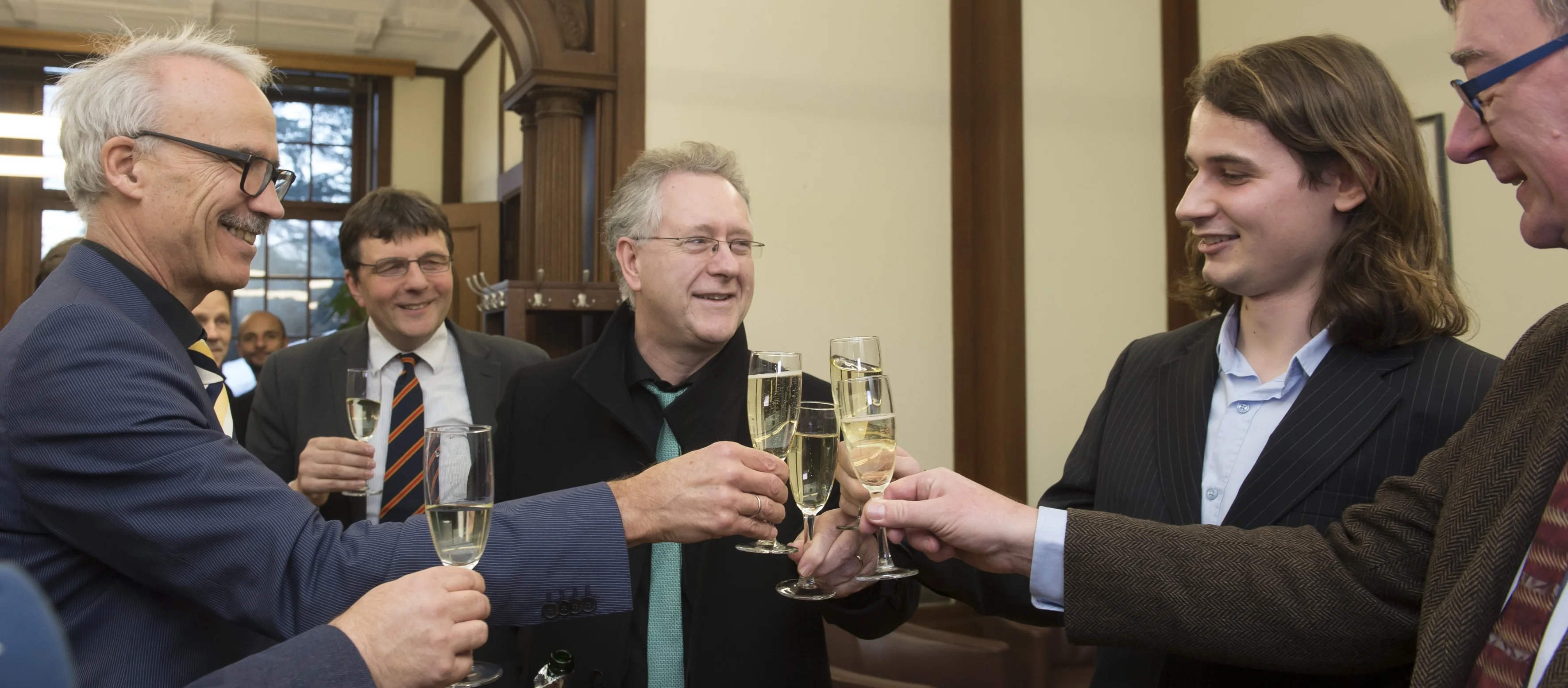 (v.l.n.r.): Kanzler Dr. Lutz und Rektor Prof. Hoch stoßen mit Preisträger Prof. Peter Scholze und Forschungs-Prorektor Prof. Andreas Zimmer an.