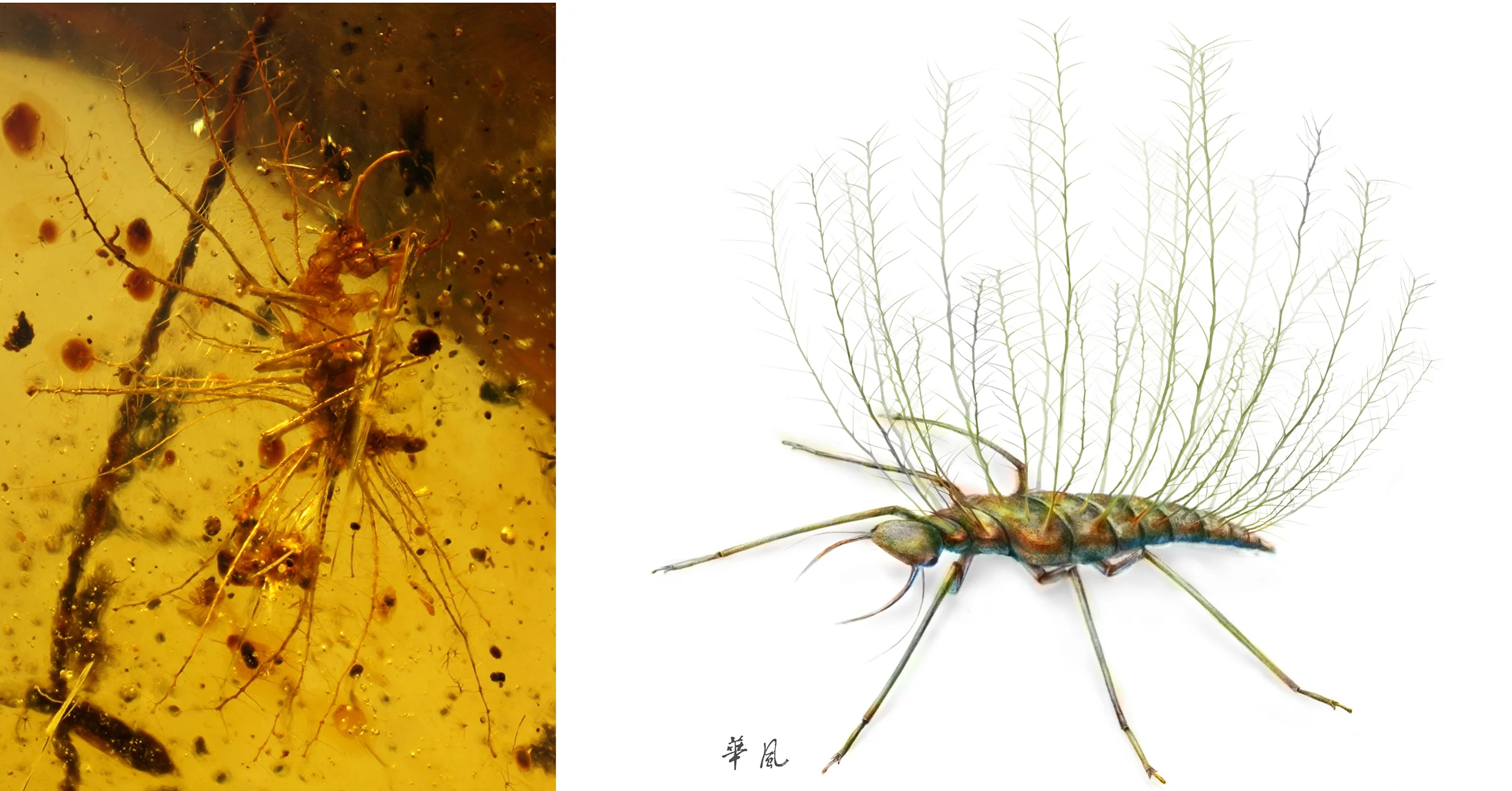 (links) aus extrem langgestreckten, borstenartigen Verlängerungen auf dem Thorax und Abdomen. Rechts: Rekonstruktion einer noch nicht getarnten Florfliegenlarve.