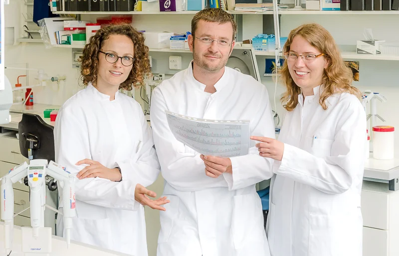 Dr. Ronja Adam, Prof. Dr. Stefan Aretz und Dr. Isabel Spier (von links) von der Arbeitsgruppe „Familiärer Darmkrebs“ am Institut für Humangenetik des Universitätsklinikums Bonn.