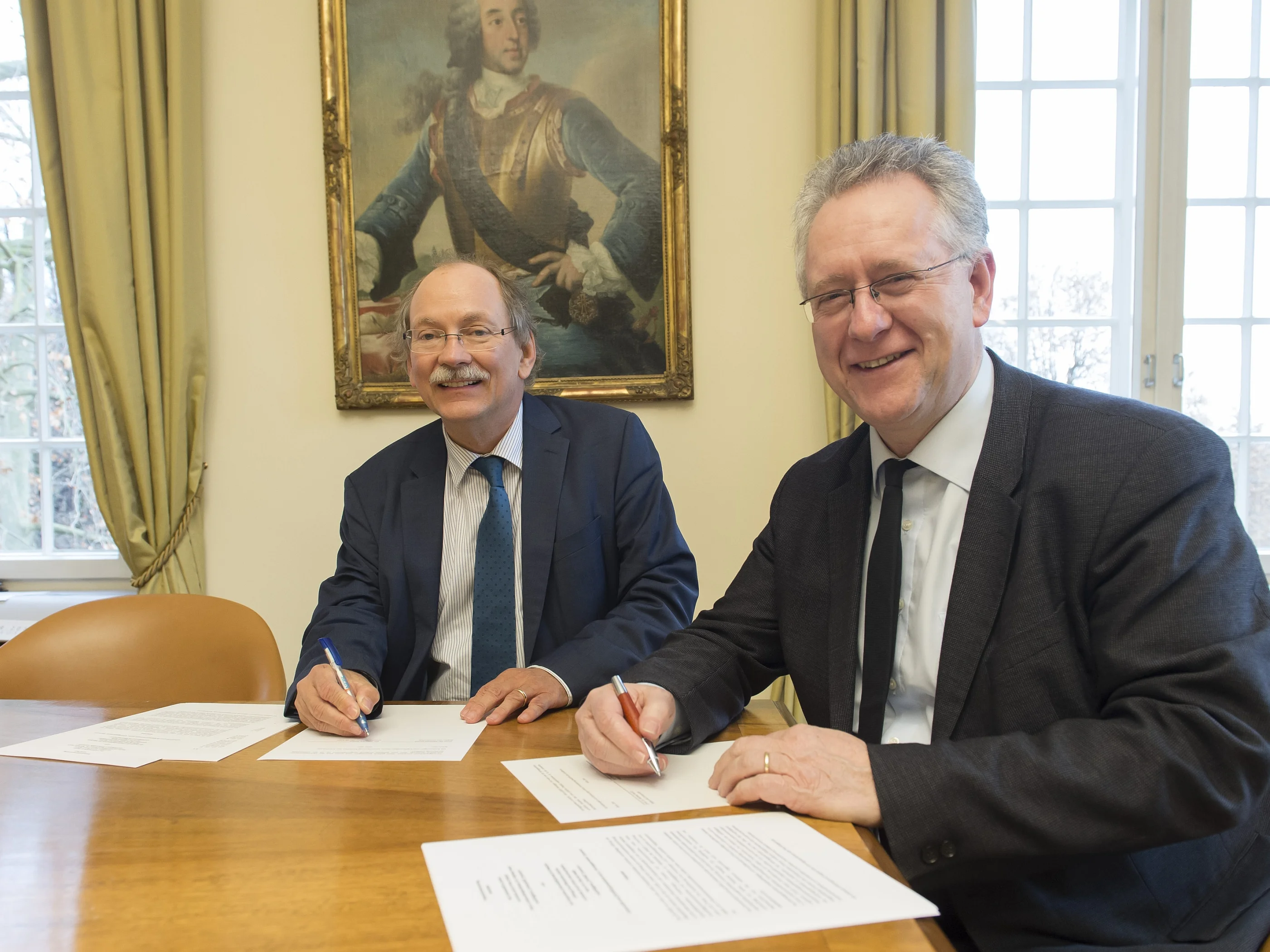 Rektor Prof. Dr. Michael Hoch (re.) und der Direktor von ZB MED, Dr. Dietrich Nelle, unterzeichnen den Kooperationsvertrag.