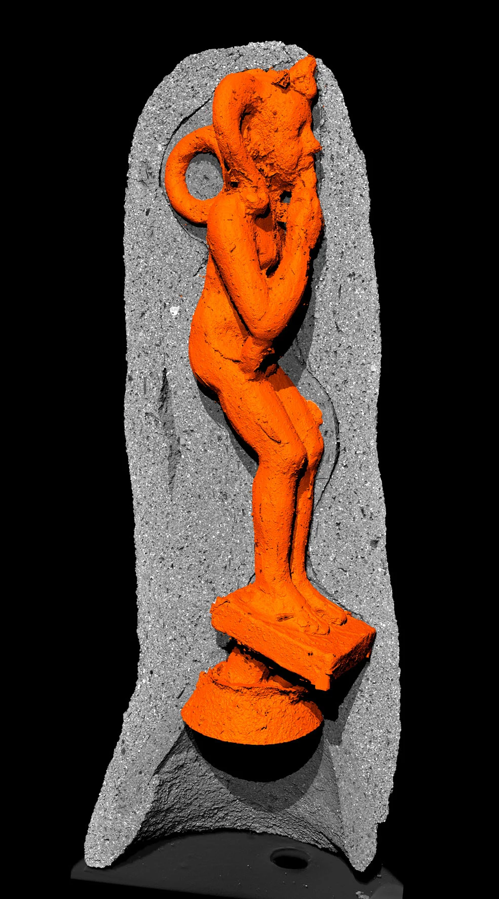 Rekonstruktion des Inneren der Gussform für eine Statuette des Gottes Harpokrates im µCT. Die Gussform war vollständig leer, der Hohlraum wurde virtuell „geflutet“ und so die für den Guss vorgesehene Statuette rekonstruiert (rot),