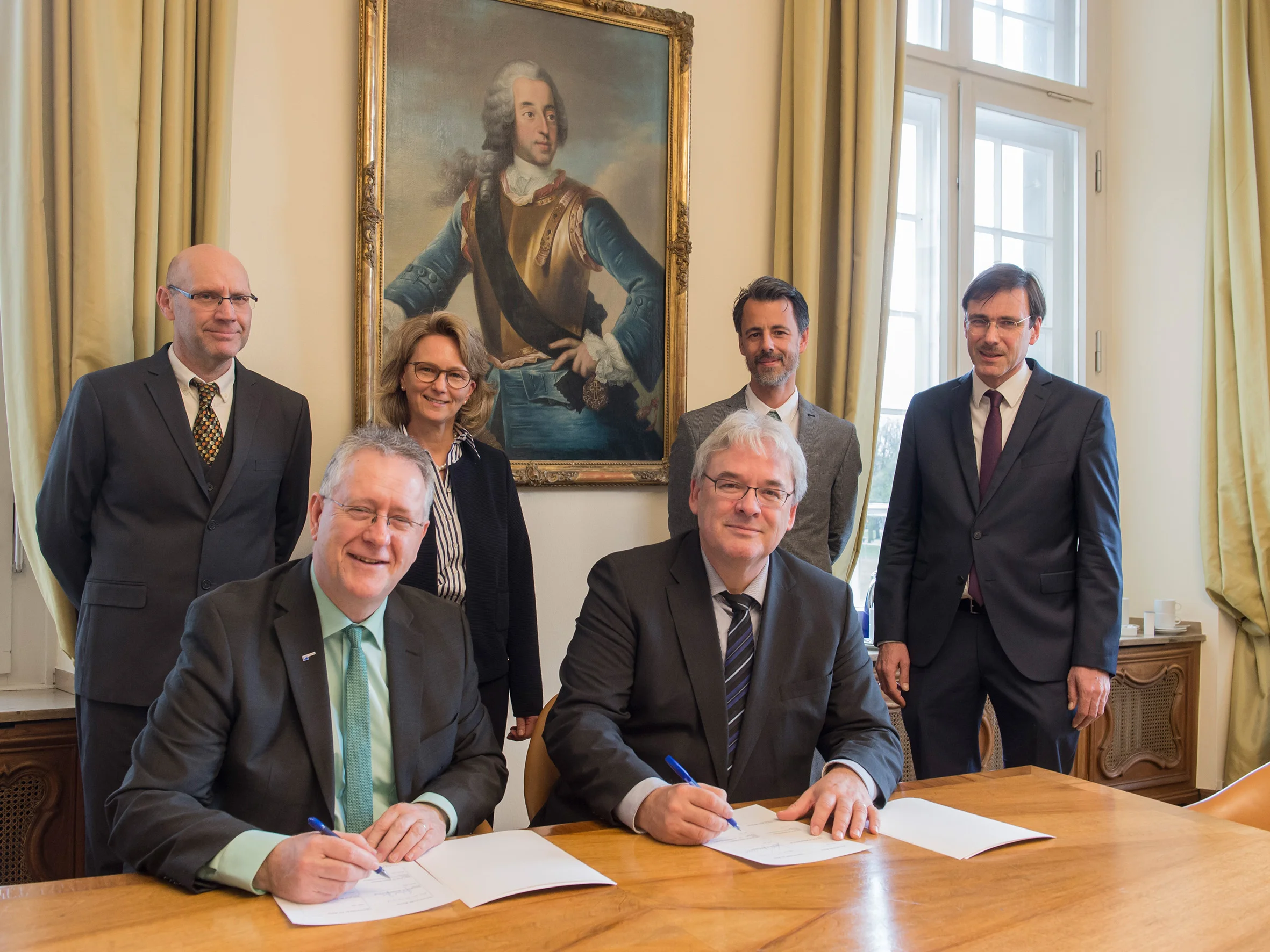 zum Bonn-Cologne Research Institute in Economics (BCecon) im Rektorat der Universität Bonn: Die Rektoren Prof. Dr. Michael Hoch (vorne links, Universität Bonn) und Prof. Dr. Axel Freimuth (vorne rechts, Universität zu Köln) sowie die Professoren Benny Moldovanu, Bettina Rockenbach, Felix Bierbrauer und Daniel Zimmer (hinten von links).
