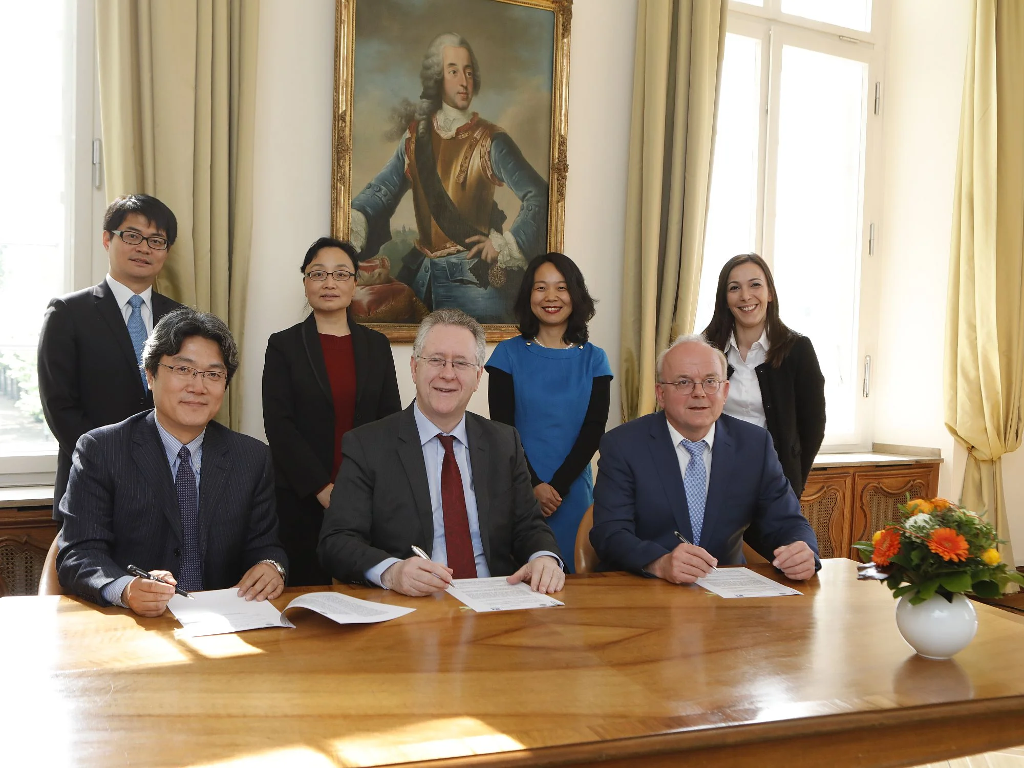 Vorne von links: Vizepräsident Prof. Zhang Baojun (Beijing Language and Culture University), Rektor Prof. Dr. Michael Hoch und Prof. Dr. Ralph Kauz (Vorsitzender des Trägervereins).