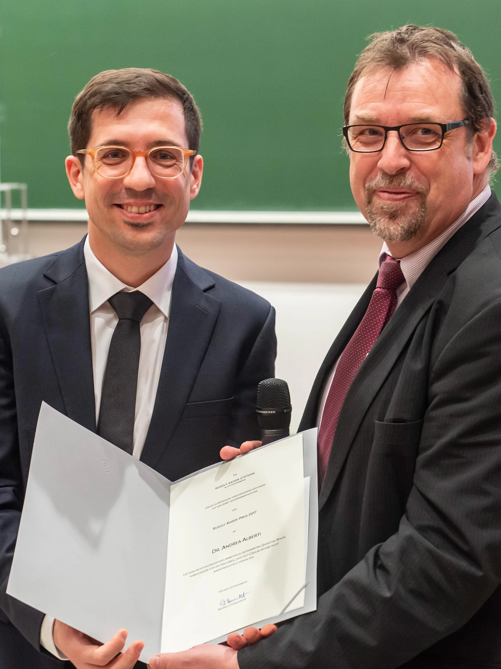 Dr. Andrea Alberti (links) vom Institut für Angewandte Physik der Universität Bonn erhält von Rainer Lüdtke vom Deutschen Stiftungszentrum die Urkunde.