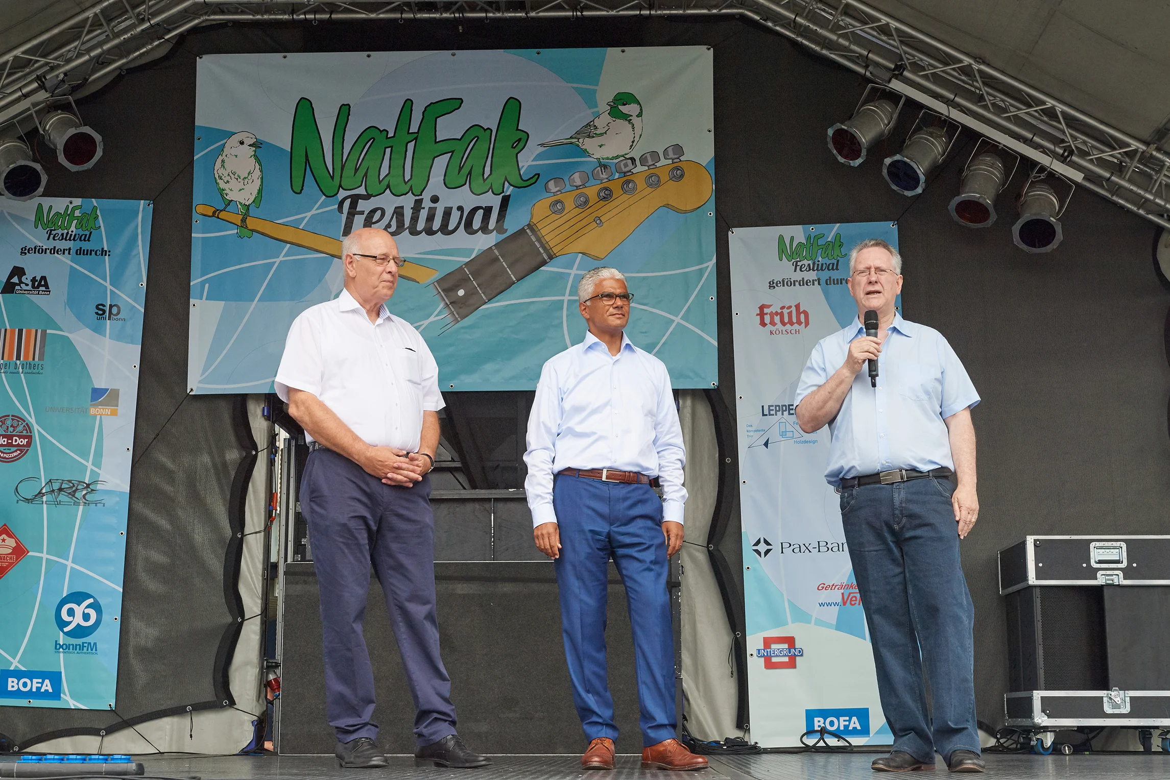 Prof. Dr. Dr. h.c. Michael Hoch (rechts) eröffnete zusammen mit Oberbürgermeister Ashok Sridharan (Mitte) und Michael Kranz, Vorsitzender der Universitätsgesellschaft, das Sommerfest.