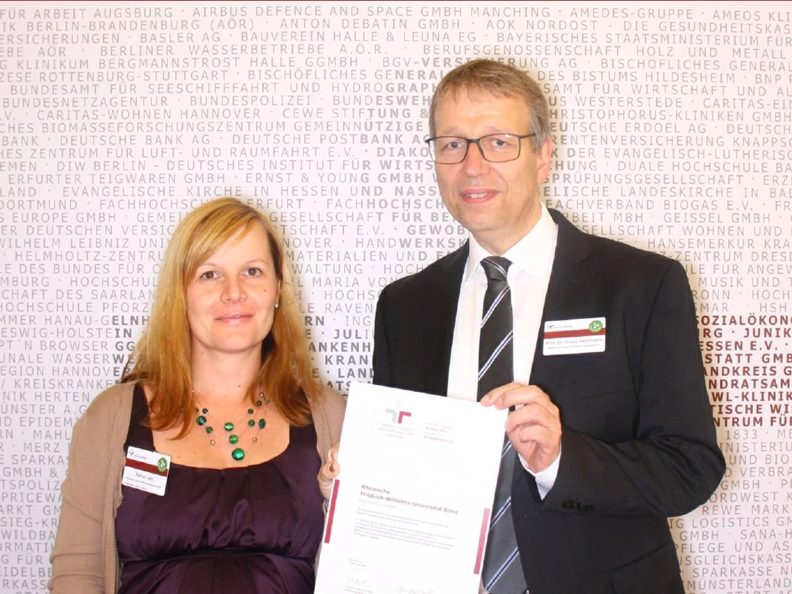 Die Leiterin des Familienbüros, Xenia Lehr, und der Prorektor für Hochschulplanung und -entwicklung, Prof. Dr. Klaus Sandmann, haben in Berlin das Zertifikat des Audits "Familiengerechte Hochschule" entgegengenommen.