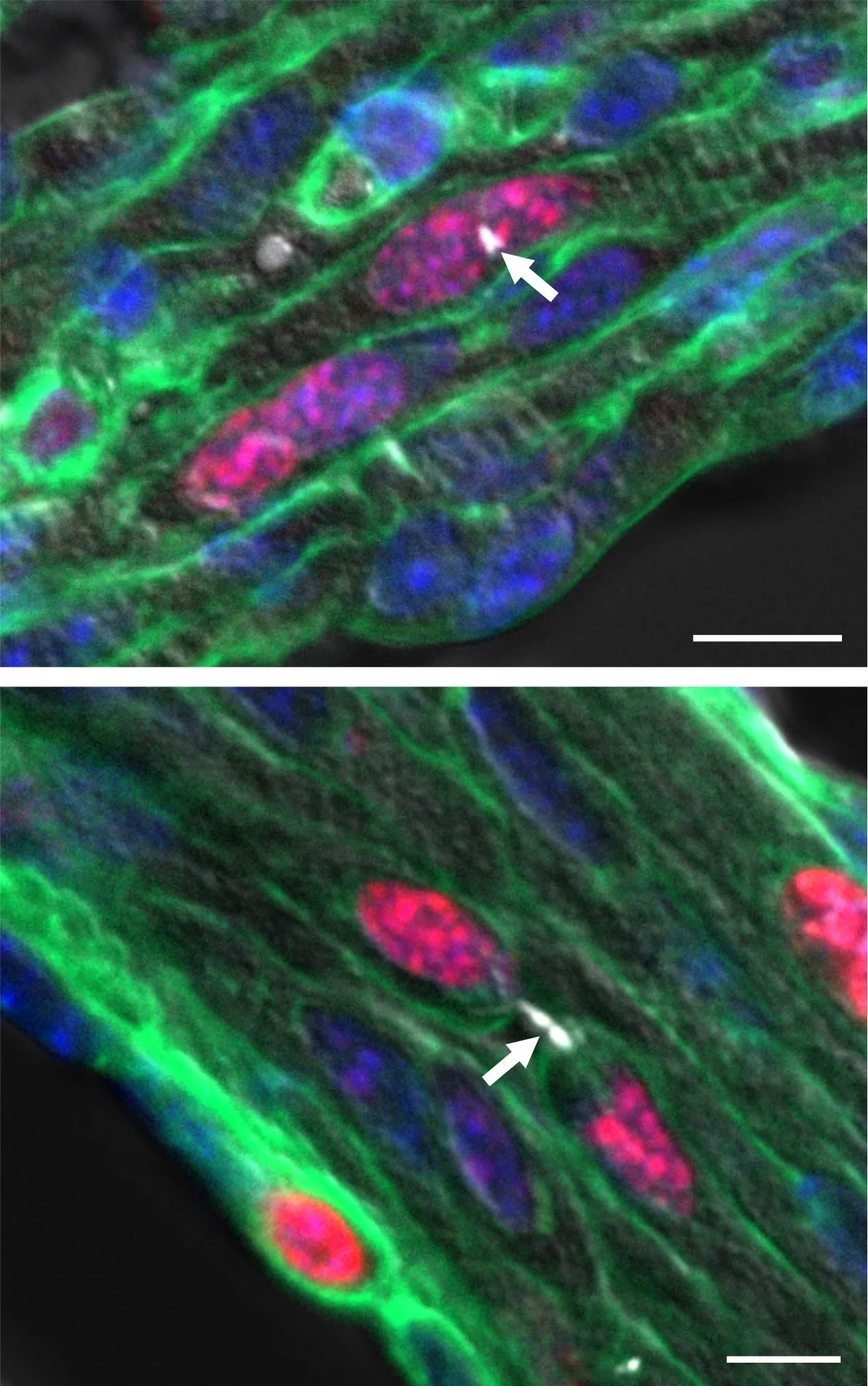 in einem Gewebsschnitt des Mausherzens. Der Mittelkörper (weiß; Pfeil) ist in der oberen Abbildung etwas zum Rand verschoben; zudem liegen die Kerne (rot) hier näher beieinander als bei der sich teilenden Zelle.