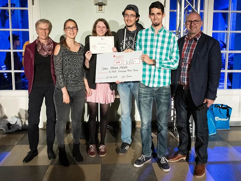 "Hakuna Matata" heißt das Siegerteam der Scavenger Hunt der Uni Bonn. Prorektorin Karin Holm-Müller (li.) gratulierte. hamuna-matata.webp image/webp Typ image/webp Dimension Abmessungen 800x600 Size Dateigröße 114.7 KB Herunterladen Bild in voller Größe anzeigen…